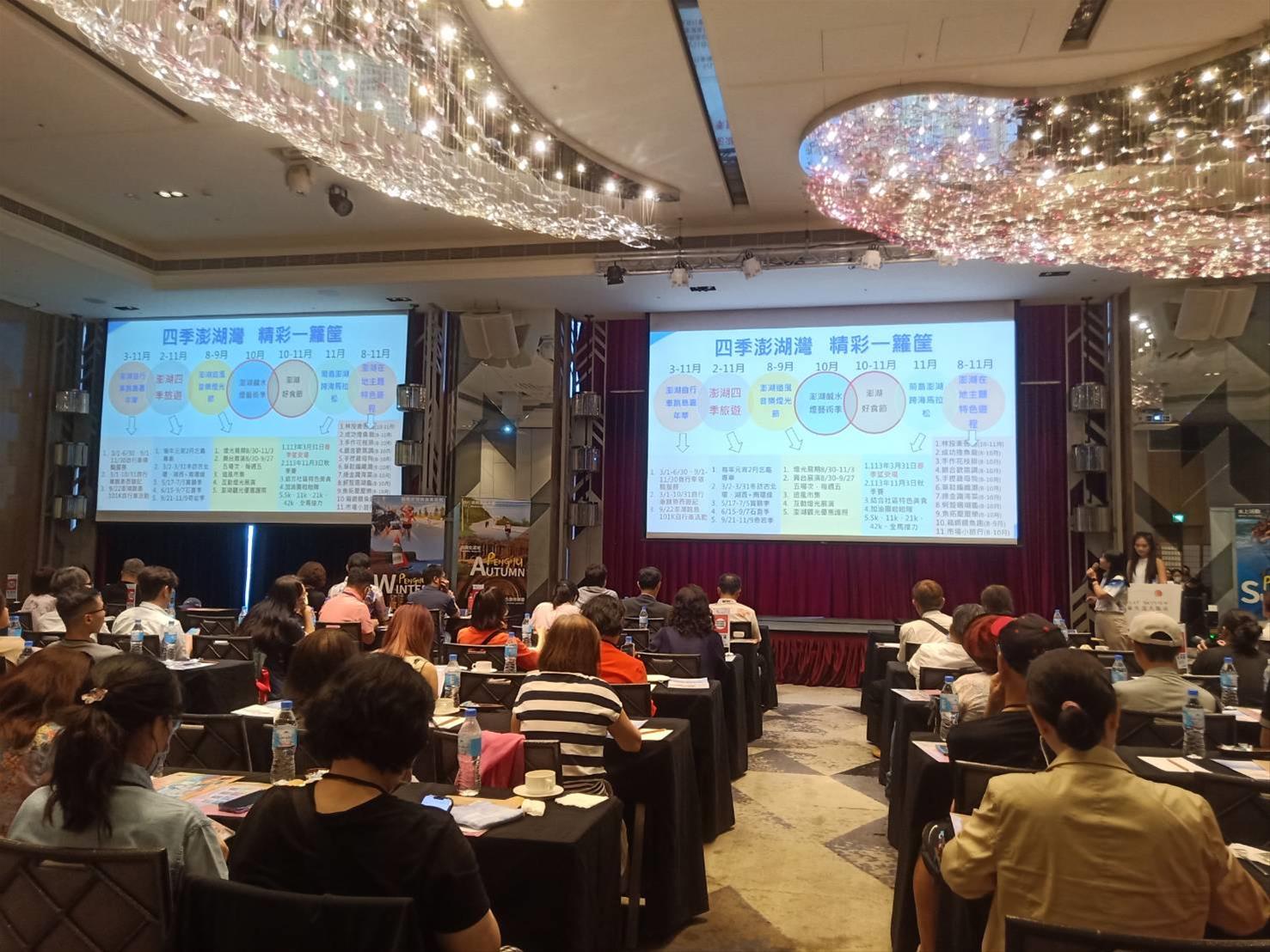 為提升澎湖旅遊能見度,加強行銷澎湖淡季觀光系列活動及四季主題經典行程,交通部觀光署澎湖國家風景區管理處(以下簡稱澎管處)與澎湖觀光圈共同於113年7月17日(星期三)在台北格萊天漾大飯店舉行澎湖旅遊同業推介說明會,本場活動共吸引約70家旅行業者,近百位貴賓出席,包含中華民國觀光導遊協會、中華民國旅行商業同業公會全國聯合會、中華民國旅行業經理人協會、立榮航空、華信航空等相關旅遊公協會及澎澄飯店、福朋喜來登酒店、貝富門股份有限公司、長春大飯店等代表出席參與。可見對澎湖的旅遊市場高度看好,希以透過旅遊包裝行銷,提高澎湖文化與地景風貌的知名度,並藉由整合四季旅遊等多元旅遊方式,活絡觀光市場。