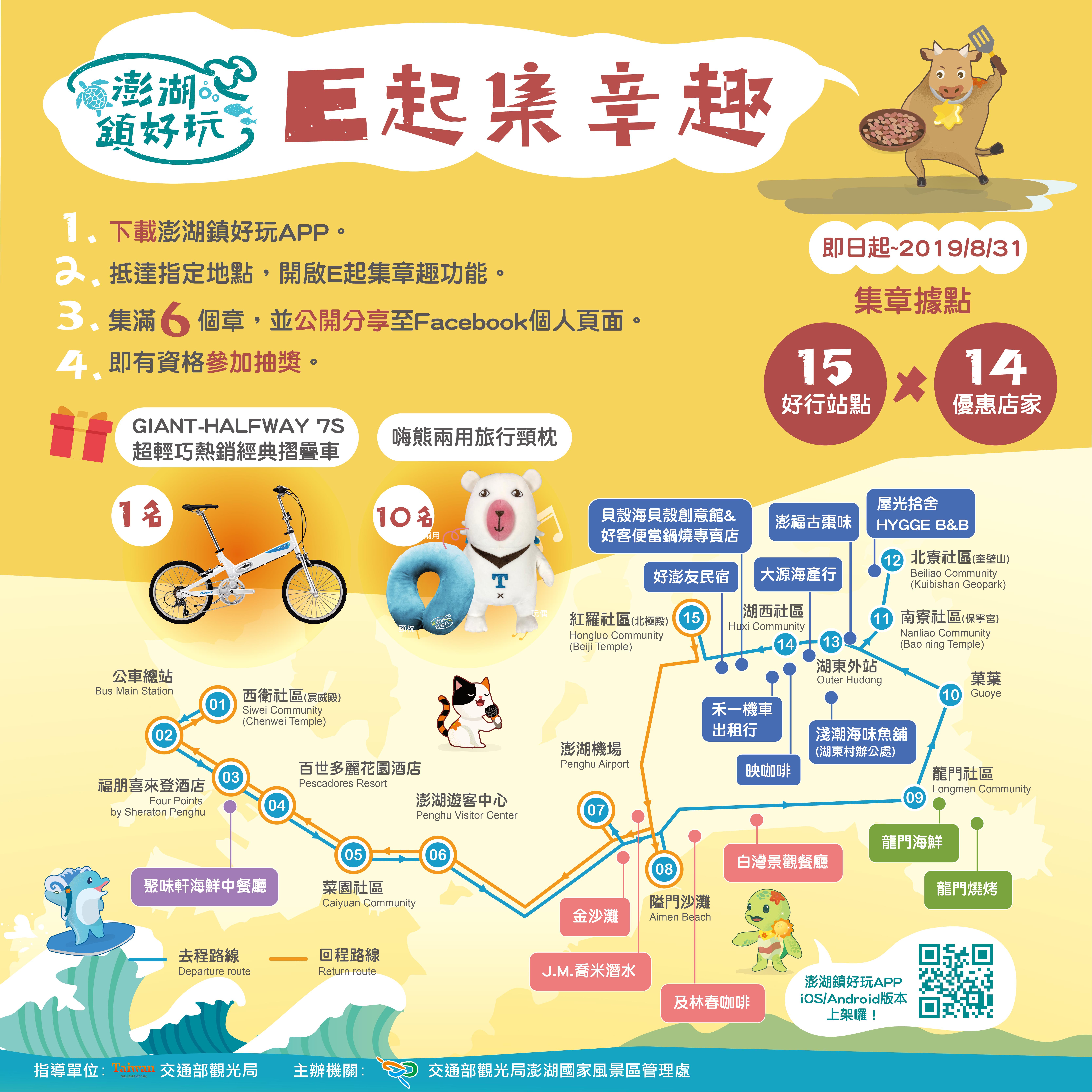 「澎湖鎮好玩,E起集章趣」活動於7月1日開跑,至湖西小鎮好行15個站點及14個在地特色優惠店家,開啟APP 「E起集章趣」頁面、蒐集6個活動集章,並公開分享至個人臉書頁面,就有機會獲得GIANT 經典摺疊腳踏車、嗨熊兩用旅行頸枕等限量精美禮品。遊客可透過行動裝置相對應平台(App Store、Google Play)搜尋「澎湖鎮好玩」進行下載,詳細資訊請掃瞄「澎湖鎮好玩APP」QR code。