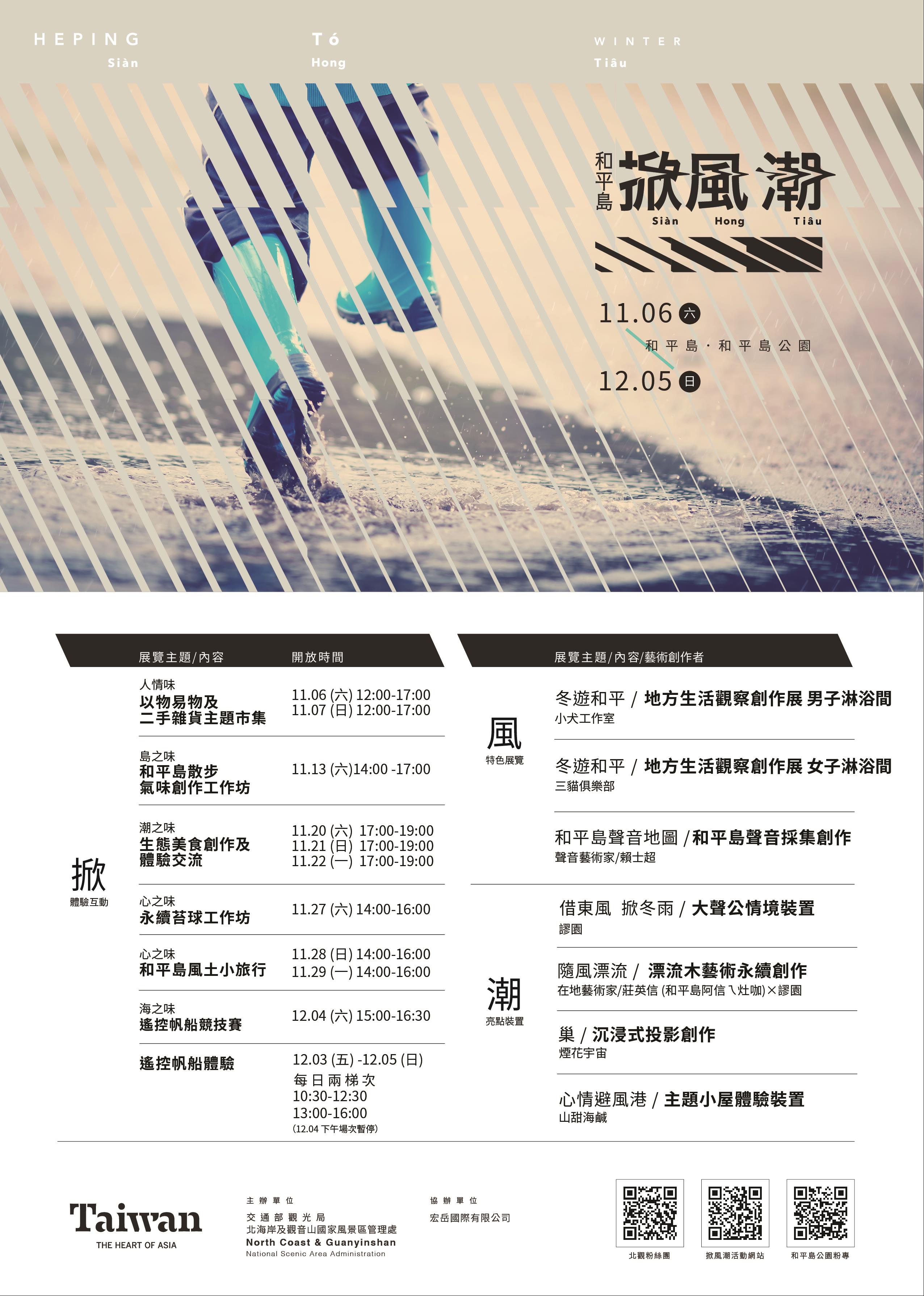 交通部觀光署北海岸及觀音山國家風景區管理處自110年11月6日至12月5日,於和平島公園推出「掀風潮」系列活動。活動詳情請至平島公園「掀風潮」官網https://www.hpipark.org/或臉書搜尋「北觀粉絲團-幸福北海岸」粉絲專頁查詢。