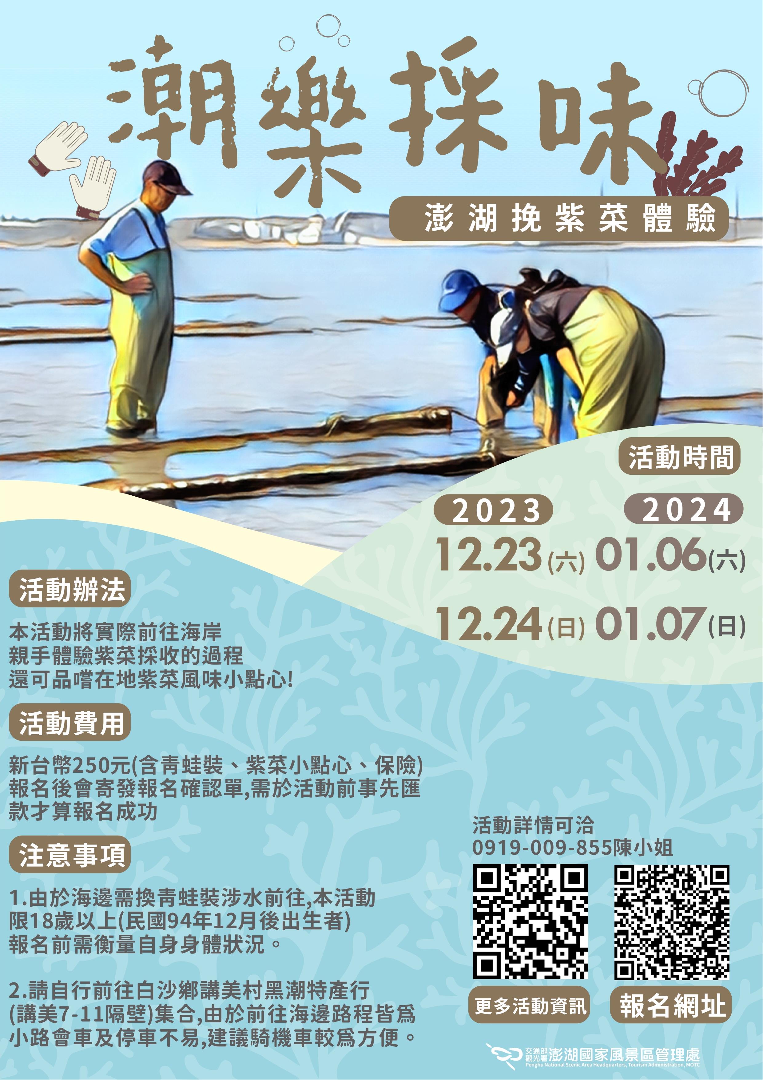 「潮樂採味-澎湖紫菜海田文化體驗」活動共有四梯次,辦理時間為:112年12月23日(六)、12月24日(日)、113年1月6日(六)、1月7日(日),配合潮汐遊客可以穿起青蛙裝一起到養殖紫菜的海中央,親自採摘新鮮紫菜,透過在地的紫菜達人,帶我們揭開紫菜養殖的神秘面紗,途中更介紹豐富的潮間帶生態,以永續的概念帶給民眾對於澎湖海域不同以往的感受,換完裝還可以享用美味的紫菜丸子及相關製品,感受滿滿的澎湖潮味。
