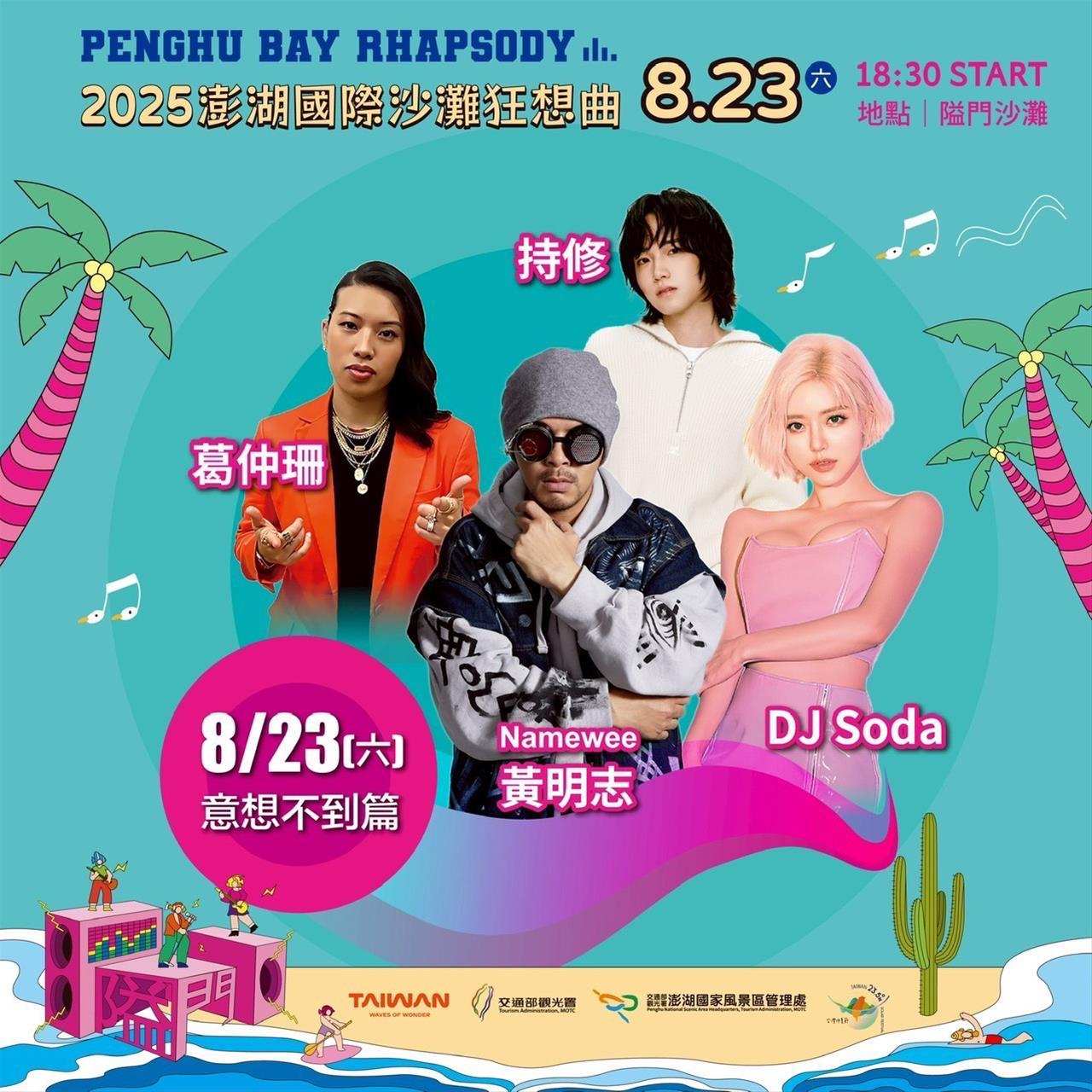 8月15日及16日兩天活動不僅讓海島音樂、動漫文化與觀光資源完美融合,也成功營造出屬於澎湖的國際級夏季品牌盛事。接下來8月23日(六)的壓軸「意想不到篇」,將邀請到海內外超人氣藝人持修、葛仲珊、DJ Soda及黃明志等重磅卡司登場,勢必再掀高潮!更多活動資訊,歡迎持續關注澎管處官方臉書專頁。