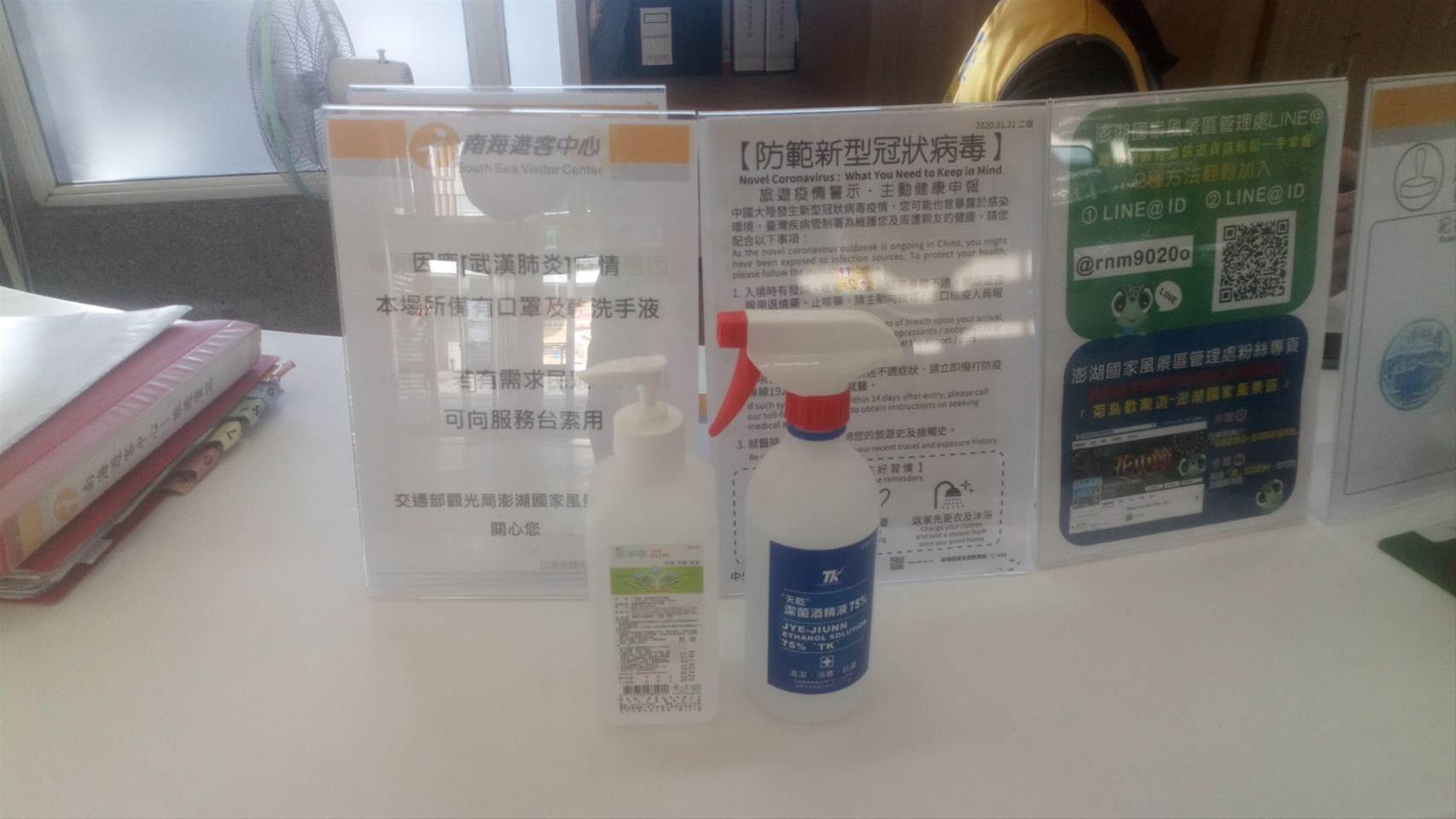 交通部觀光署澎湖國家風景區管理處為加強因應武漢肺炎疫情,自年假期間起全面於各遊客中心(館室)實施防疫措施,除加強檢視供水設施、進行設施消毒清潔,現場服務人員每日帶口罩、自主量體溫及加強自主健康管理,同時服務台備有乾洗手液,提供有需求民眾使用,並於各遊客中心、官網、FB、官方LINE加強宣導防疫措施。