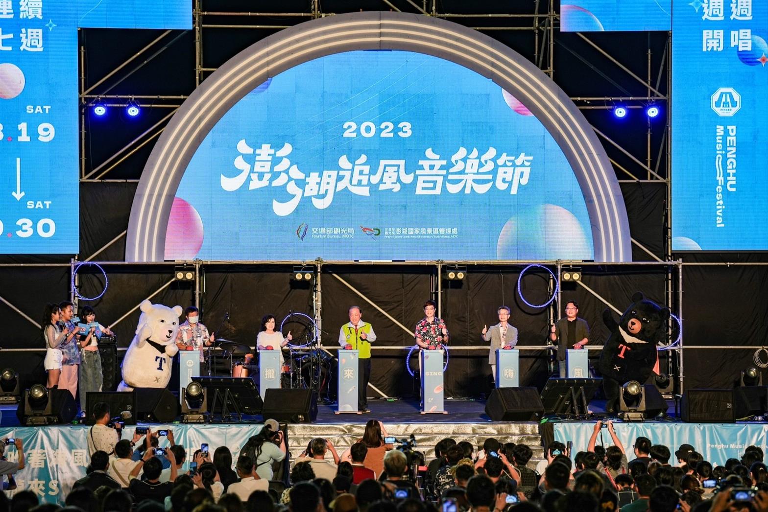 「2023澎湖追風音樂節」今(19)日在澎湖觀音亭園區磅礡開幕,由謝金燕、蔡健雅及旺福領銜開唱,勁歌熱舞嗨翻全場,現場吸引超過上萬名觀眾到場一同狂歡。開幕儀式由交通部觀光署林信任副局長、澎湖縣政府陳光復縣長、行政院南部聯合服務中心陳慧玲副執行長、交通部觀光署澎湖國家風景區管理處(以下簡稱澎管處)許宗民處長、馬公市黃健忠市長以及現場上萬名遊客,一同點亮主題光環境「光島盛典」,也點亮澎湖夜晚,讓現場民眾感受璀璨耀眼的澎湖!