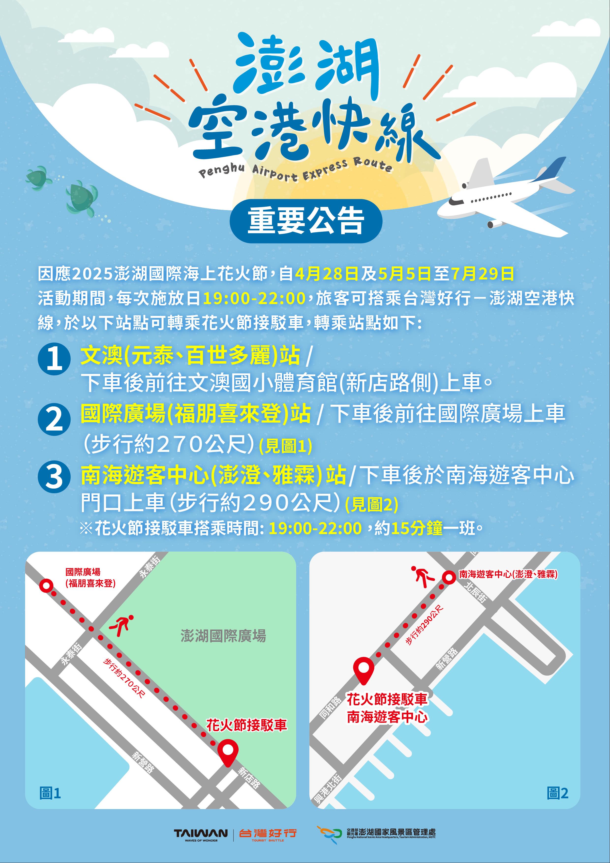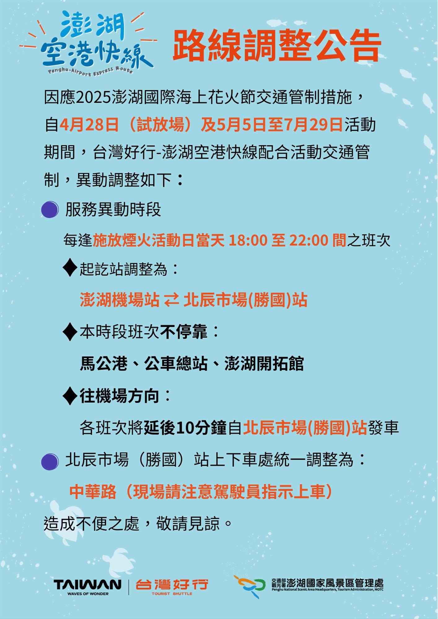 因應2025澎湖國際海上花火節交通管制措施,自4月28日(試放場)及5月5日至7月29日活動期間,台灣好行空港快線配合活動交通管制,異動調整如下: