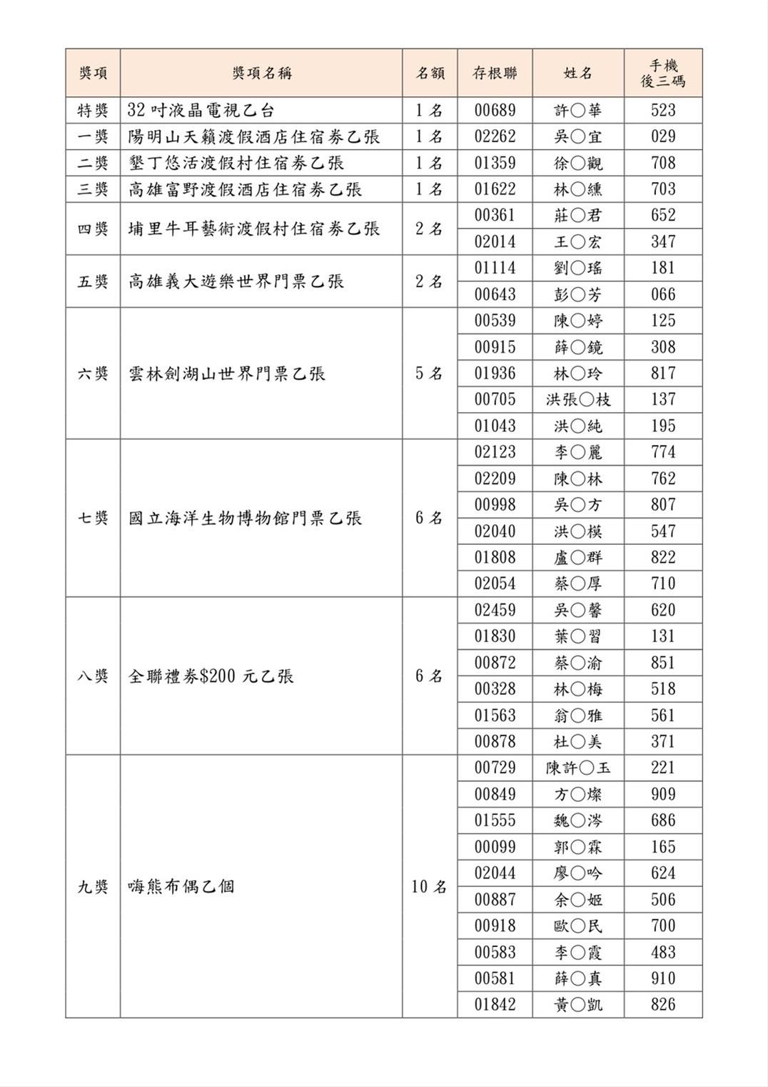 「2024澎湖元宵暨冬之訪古輕旅行」之抽獎活動於4月3日下午2時整在澎管處第2會議室辦理,並透過錄影及網路(FB)直播公開抽獎內容,共計10個獎項,總計35位幸運名額由澎管處呂玉鉛副處長依序抽出,最大獎項32吋液晶電視,由澎湖縣許姓民眾獲得;得獎名單將於2日內公布在「澎湖國家風景區管理處」粉絲團及「2024澎湖四季旅遊 」社團,獲獎名單公告後,將會電話通知各獎項獲獎者提供獎品收件地址及相關聯絡資訊,以利後續獎品郵寄寄出。所有獎品將於1個月內由承辦單位以掛號方式寄達得獎者,歡迎民眾上網查詢。