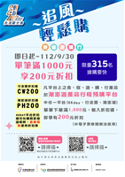 為使來到澎湖追風音樂節的旅客們能體驗到最道地的澎湖風情,自即日起至9月30日,交通部觀光署澎湖國家風景區管理處於「潮澎遊產品行程預購平台」特別推出「追風輕鬆購」行銷活動:凡於潮澎遊預購平台中任一導購平台(KKday、行走雲、潮澎湖)單筆下單滿1,000元,輸入優惠碼,即可享有200元超值折扣。