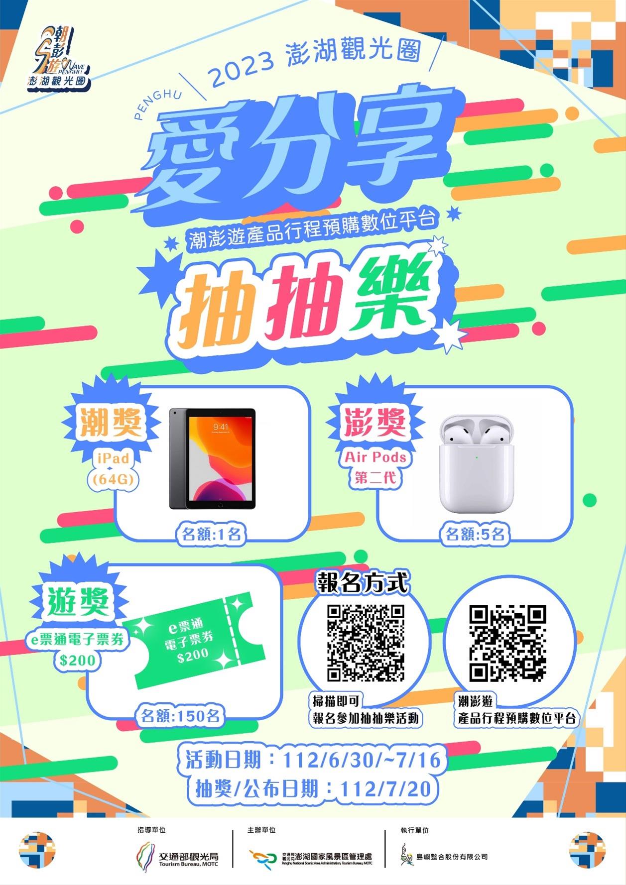 為加強行銷澎湖觀光圈-潮澎遊產品行程預購平台商品導購資訊露出及使用流量,交通部觀光署澎湖國家風景管理處(以下簡稱澎管處)特別推出第一檔的潮澎遊預購平台–「愛分享抽抽樂」活動,活動期間將於6月30日起至7月16日止,民眾可於活動期間每日至潮澎遊預購平台(https://activity.penghu-nsa.gov.tw/) 截圖最喜歡的產品或遊程,將圖片分享至個人自媒體(如FB、IG、抖音等社群)並撰寫推薦文字(50字以下),文字內容需標註#指定關鍵字,再將分享文章連結網址填寫至Google表單,即可參加抽獎,獎項除了有高達150名e票通電子票券、5名AirPods第2代,還有機會可以抽到最大獎iPad。愛分享抽抽樂活動網址: