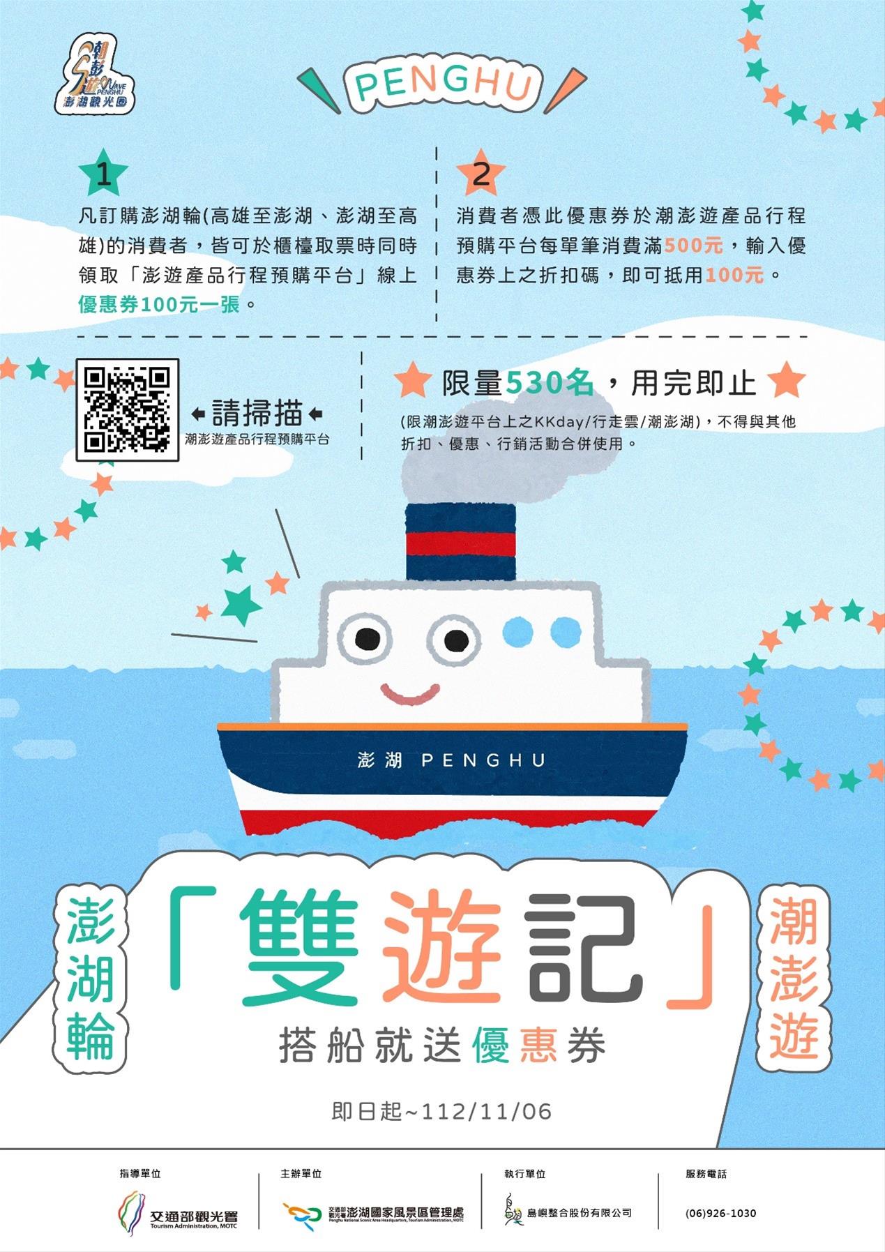 自即日起至112年11月6日止,潮澎遊特別結合澎湖輪進行聯合行銷活動,只要搭船就送優惠券,讓旅客在選擇往來澎湖及高雄的交通工具時,將澎湖輪作為第一選擇,來趟澎湖高雄「雙遊記」。凡於活動期間內訂購澎湖輪(高雄至澎湖、澎湖至高雄)的消費者,皆可於櫃檯取票同時領取「潮澎遊產品行程預購平台」100元優惠券一張,消費者憑此優惠券於潮澎遊產品行程預購平台訂購商品,每單筆訂單消費滿500元,輸入優惠券上之折扣碼,即可抵用100元,優惠券使用期限至112年11月15日止。