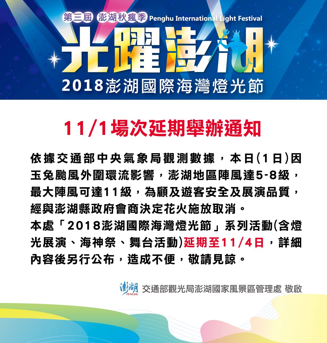 依據交通部中央氣象局觀測數據,本日(1日)因玉兔颱風外圍環流影響,澎湖地區陣風達5-8級,最大陣風可達11級,為顧及遊客安全及展演品質,經與澎湖縣政府會商決定花火施放取消,本處「2018澎湖國際海灣燈光節」系列活動(含燈光展演、海神祭、舞台活動)延期至11/4日,詳細內容後另行公布,造成不便,敬請見諒。