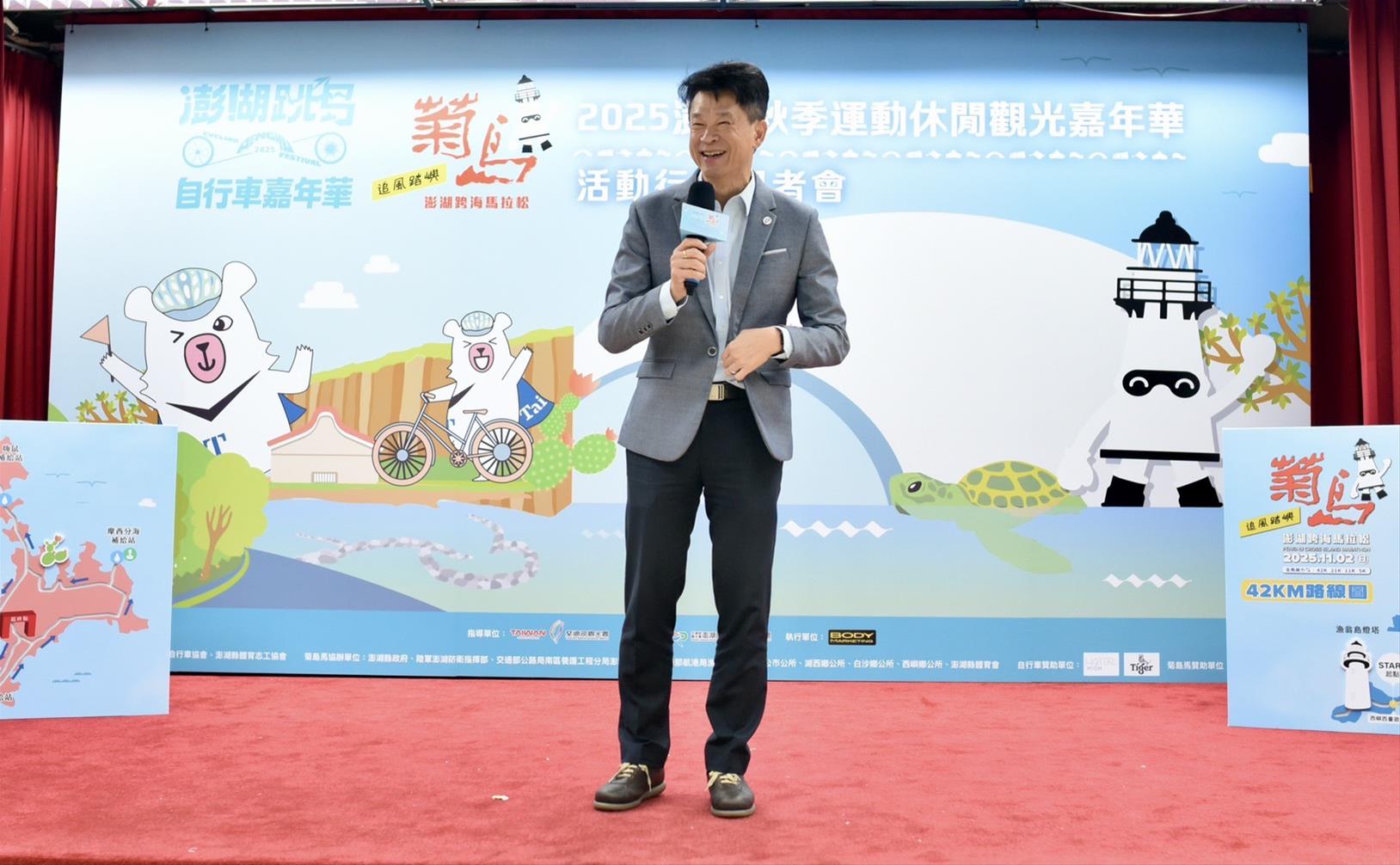 觀光署黃勢芳副署長於致詞時表示「澎湖跳島101K自行車」與「菊島澎湖跨海馬拉松」已經舉辦多屆,多變的地形與沿途景致加上秋冬季節開始的美味海鮮,在全台的運動休閒賽事中已具名氣,每年都吸引許多國內外選手共襄盛舉。今年活動亦增添許多亮點,包含自去(113)年菊島馬首度結合日本沖繩馬,今年雙方特別深化合作模式,跳島101K自行車活動也將與著名的環沖繩自行車賽共同行銷,互相宣傳。此外也錄製精彩的活動宣傳影片,把澎湖優美自行車道沿途中所有好吃、好玩、好看,透過畫面傳達給日本車友知道。至於菊島澎湖跨海馬拉松,今年仍再度攜手日本沖繩馬拉松,藉此吸引更多日本好手前來菊島一較高下,讓更多國際跑友認識澎湖、愛上澎湖。