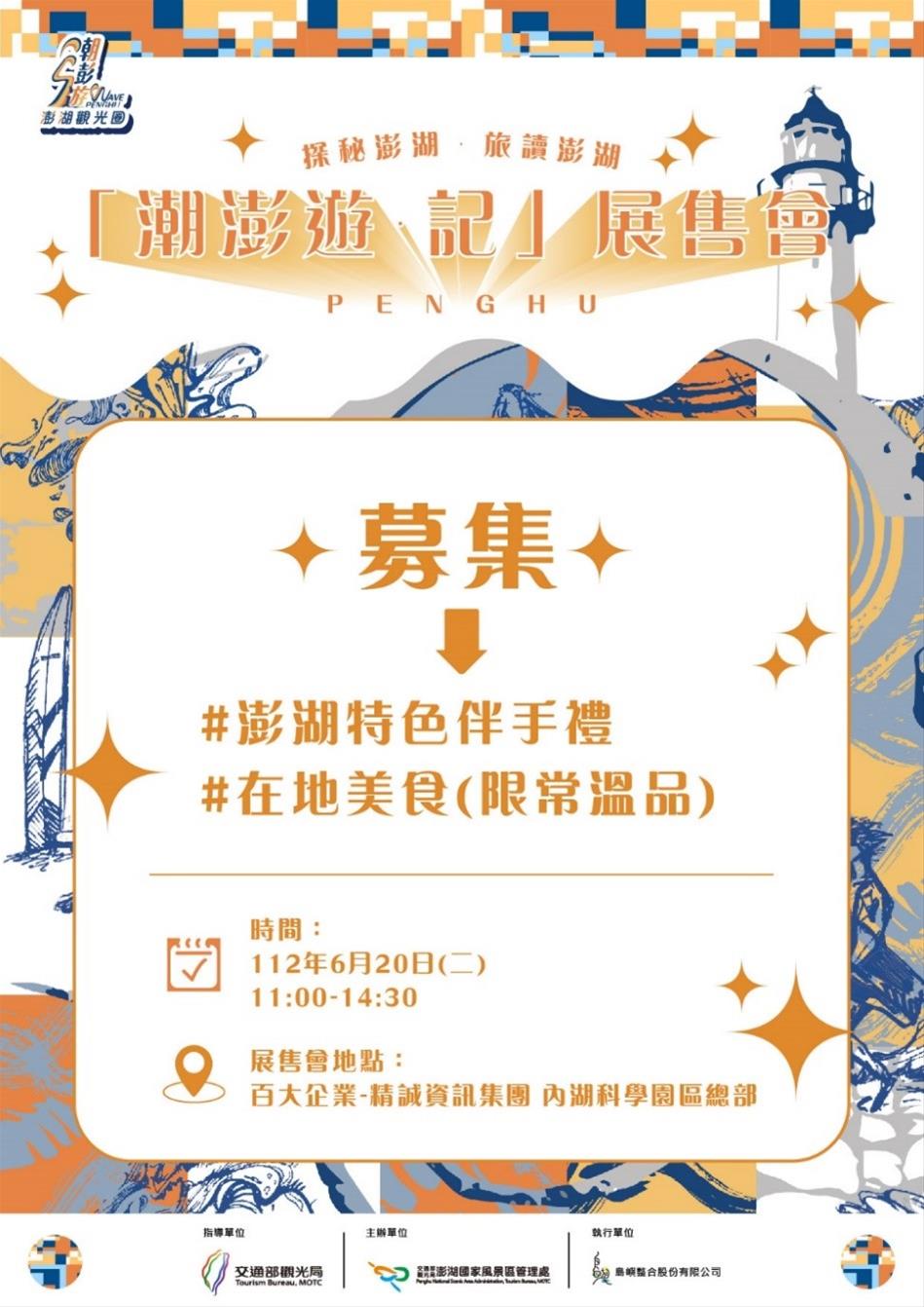 「潮澎遊.記」展售會將於6月20日(星期二)上午11時至下午2時30分於內湖科學園區精誠資訊集團總部舉辦,本次展售產品以常溫性伴手禮品「食」、「購」為主,「宿、遊、行」每家業者也可提供最多20份DM至展售會露出,採實體展售及產品DM介紹方式並行,同時增加潮澎遊產品行程預購數位平台曝光度,提升澎湖觀光整體知名度。另外,為針對「澎湖觀光圈e票通」電子票券即將發行的消息作暖身,現場還有電子票券2,000元購物金抽獎活動,展現澎湖觀光的宣傳活力。