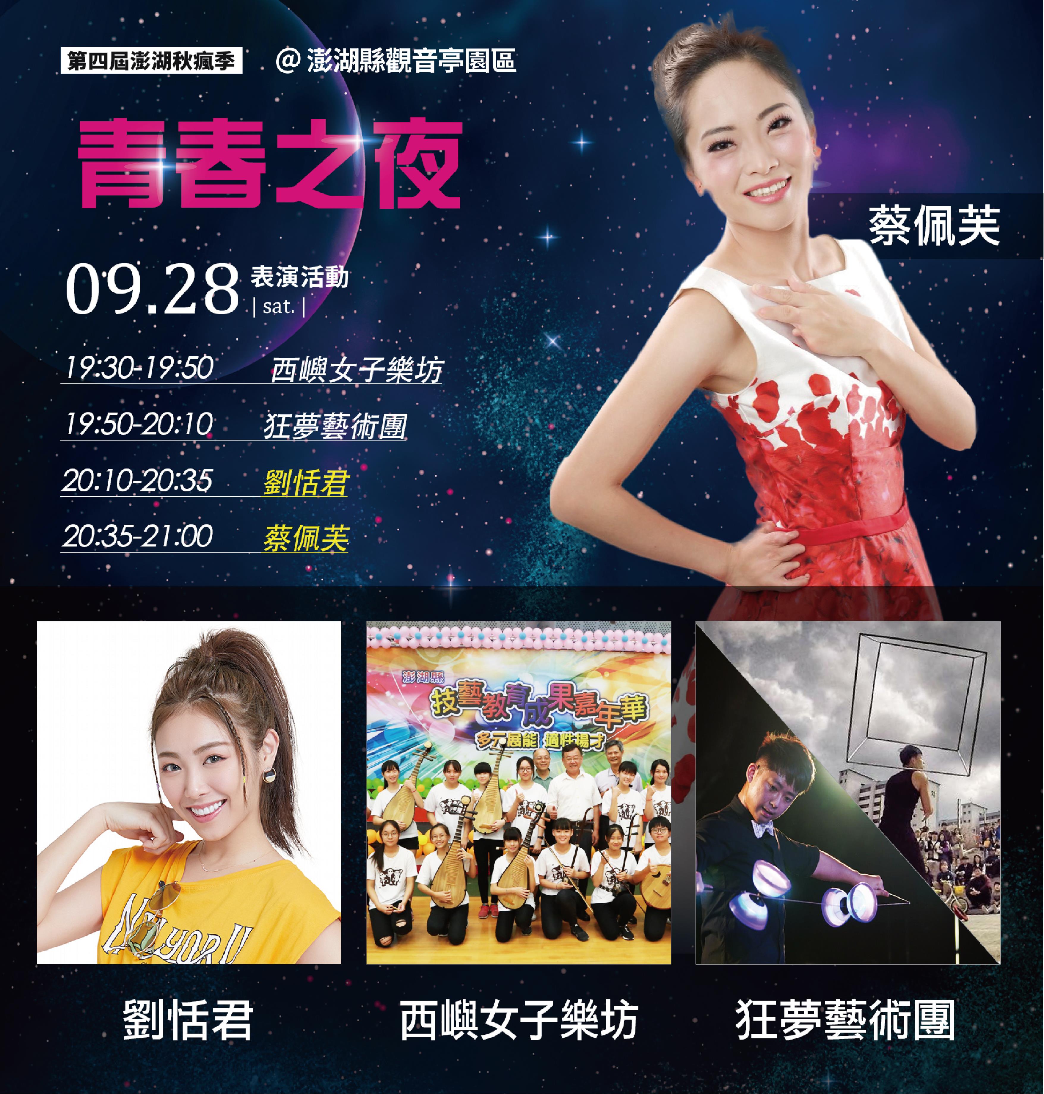 夏天看花火,秋天看燈光!由觀光局澎管處主辦的「2019年澎湖國際海灣燈光節」活動持續發燒至11月2日,本週六舞台之夜以代表澎湖縣至台灣參加全國室內絲竹賽的西嶼女子樂坊開啟狂熱夜晚,更邀來參與過聲林之王的甜美女唱將劉恬君、參與過超級偶像與超級歌喉讚的三指歌后蔡佩芙,以及由熱愛表演藝術的表演者們匯集而成的狂夢藝術團,結合魔術、雜耍特技元素,歷經五年於世界各地留下淬鍊的蹤跡,9/28不要錯過這群熱血追夢的群星接力演出!