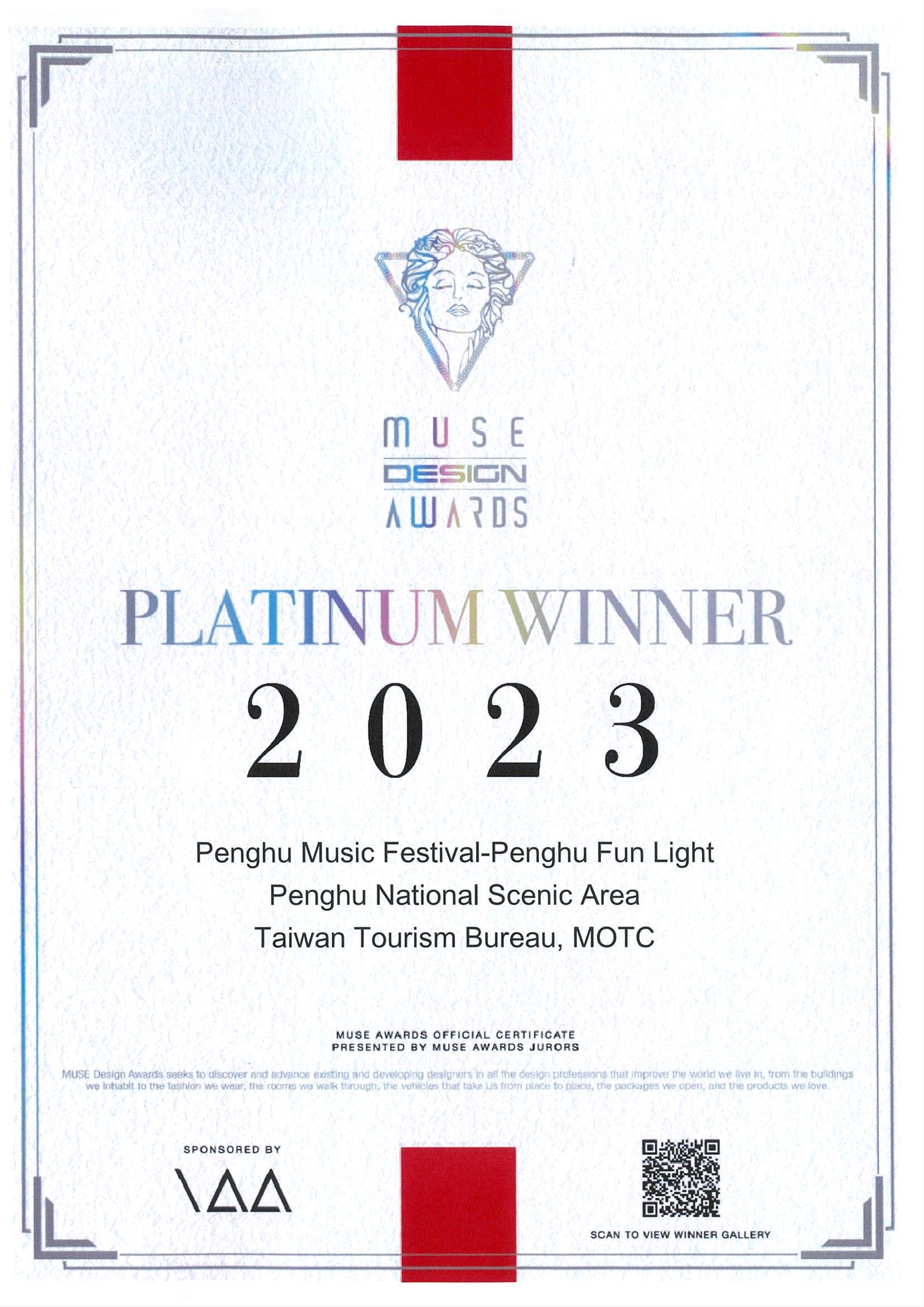 交通部觀光署澎湖國家風景區管理處近日喜訊不斷, 111年製作的澎湖觀光圈宣傳影片,甫榮獲美國IAA國際獎項協會所屬謬思創意獎三項大獎(「影片/旅遊」類別及「影片/生活風格」類別兩項金獎、一項銀獎)肯定。「2022澎湖追風音樂節」整體光環境設計再次傳來好消息!榮獲美國MUSE國際設計大獎(MUSE Design Awards)概念設計-展覽與活動項目最高榮譽「鉑金獎」,繼去年榮獲美國國際獎項協會(Internationa1 Awards Associate,IAA)泰坦地產大獎(TITAN Property Awards) 景觀設計(新)-景觀創新類金獎之殊榮後,讓澎湖再次躍上國際舞台。