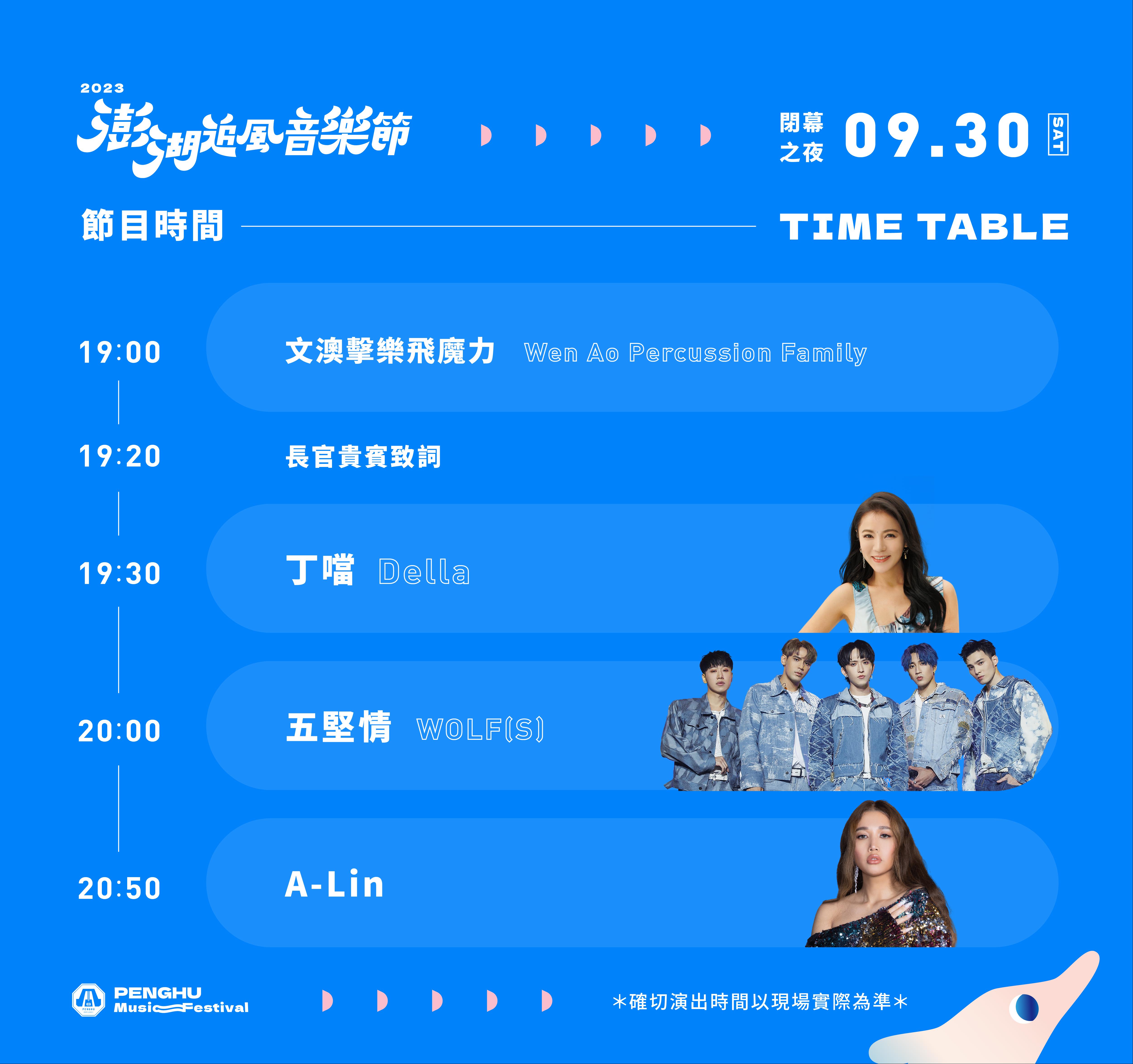 隨著活動邁入尾聲,9/30(六)閉幕之夜即將登場,當天將邀請實力派卡司;晚間七點由在地表演團體文澳擊樂飛魔力開場演出,晚間七點半情歌天后「丁噹」將帶來多首經典好歌,八點由人氣男子團體「五堅情」接力演出,更帶來50分鐘的精彩表演,要跟大家一起嗨翻澎湖,壓軸則由今年榮獲金曲歌后的天生歌姬「A-Lin」開唱,為2023澎湖追風音樂節畫下完美句點。