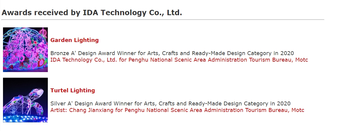 交通部觀光署澎湖國家風景區管理處辦理「2020澎湖國際海灣燈光節」繼主題燈區榮獲MUSE Creative Award謬思創意設計大獎,藝術燈區也傳來佳績,此次兩件作品「龜來運轉」、「忘憂花園」榮獲A' DESIGN AWARD (A’設計大獎賽)藝術、手工藝的設計類別(ARTS, CRAFTS AND READY-MADE DESIGN AWARD)銀獎與銅獎殊榮。