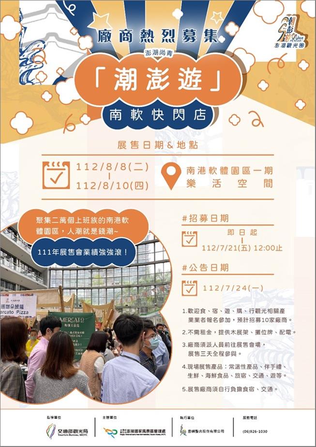 為推廣澎湖之食宿遊購行,繼6月20日於精誠資訊舉辦百大企業展售會後,再度於8月8日起至8月10日連續三天至南港軟體園區一期–樂活空間舉辦「澎湖尙青-潮澎遊,南軟快閃店」展售會!澎湖觀光圈曾於111年10月31日-11月4日在此舉辦澎湖直送展售會,短短五天內造訪人次突破1萬6,000人次,達成銷售金額90萬元之佳績。