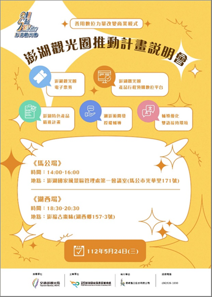 為使觀光業者了解112年度澎湖觀光圈預計推動事項,澎管處訂於112年5月24日(三)辦理2場澎湖觀光圈推動計畫說明會:馬公場訂於下午2時於本處2樓第1會議室辦理、湖西場則於晚間6時30分於澎福古棗味召開。