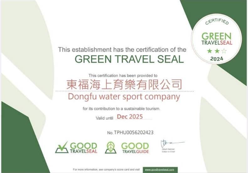 交通部觀光署澎湖國家風景區管理處自2023年起積極推動澎湖觀光產業業者申請國際永續認證,在期許業者經營模式能夠接軌國際綠色觀光趨勢的同時,更得以達到公私攜手提升澎湖永續旅遊量能之效,而在地業者也不負所望,甫迎新年即傳喜訊,東福海上育樂有限公司(活動執行/潛水中心類)與偷嗨郎民宿(民宿類),分別榮獲2024年綠色旅行標章(Green Travel Seal, GTS)之2星、1星認證,而語榕花園民宿(民宿類)也維持其2星榮耀,為澎湖永續發展、推動綠色旅遊產業鏈開啟新篇章。
