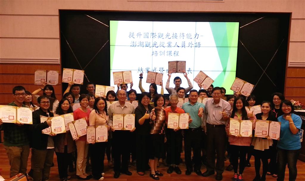 結業式在近50位學員們與文藻大學教師、澎管處謝副處長等熱鬧合照留念中,畫下完美句點。多方參與迴響的聲音,本處處長感謝之餘,期許學員們能為業界種子,一起朝為蒞澎外籍遊客提供溝通無礙的旅遊環境目標而努力。