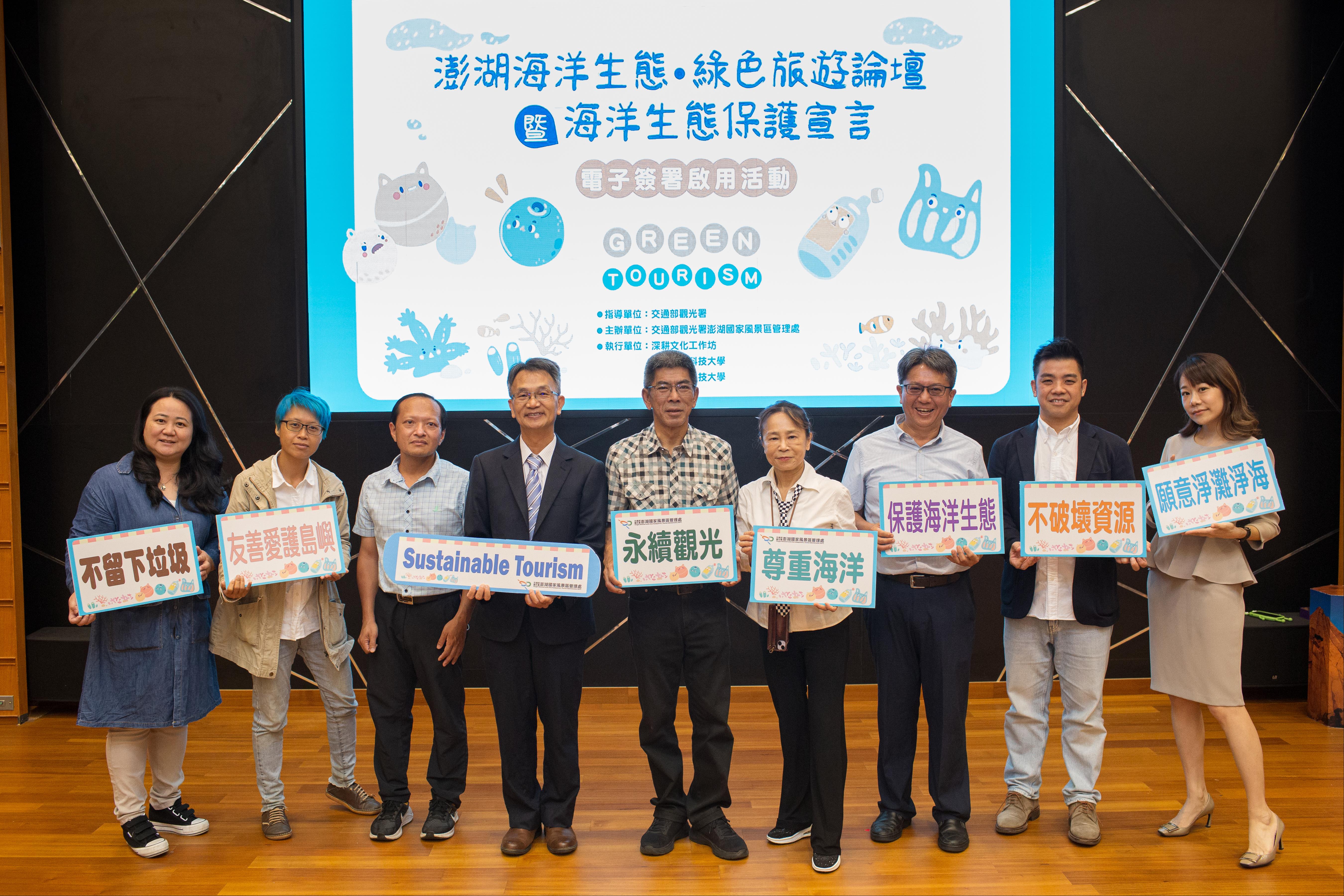 為發展澎湖海洋生態永續與綠色旅行,交通部觀光署澎湖國家風景區管理處於今(14)日假澎湖遊客中心舉辦「澎湖海洋生態·綠色旅遊論壇暨海洋生態保護宣言電子簽署啟用」活動,由觀光署企劃組吳組長潔萍主持,本次活動邀請海洋委員會、澎湖縣政府農漁局、澎湖縣水產種苗繁殖場、國立高雄科技大學、國立澎湖科技大學、日月潭國家風景區管理處、兩腳詩集‧綠活學旅Footprint Inn、海洋公民基金會、山水社區發展協會、海洋途徑等產官學多位專家,深入探討永續實踐、創新和共享的執行方式以及永續意識與旅遊的平衡,議題包含「邁向澎湖永續旅遊之路」、「日月潭與永續旅遊的距離」、「小鎮旅館的永續路上」、海洋生態旅遊之「除弊、興利與永續」及「協作與創生」主題及澎湖海洋生態旅遊示範區發表,吸引共約210人(含市集)參加,除讓參加者進一步認識如何在觀光產業中實踐永續的做法外,也讓每個人在旅遊環境中成為一個負責任的旅人,共同響應及為維護澎湖生態資源的美好付出努力。