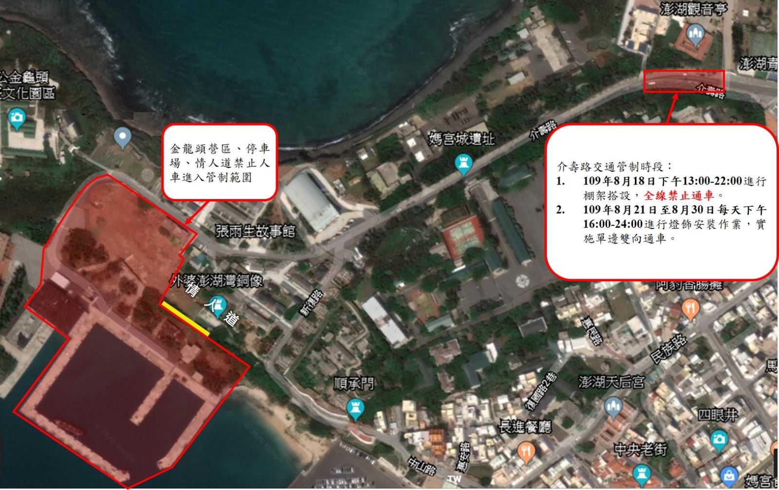 「2020澎湖國際海灣燈光節」施工作業實施交通管制,介壽路109年8月18日下午全面禁止通車