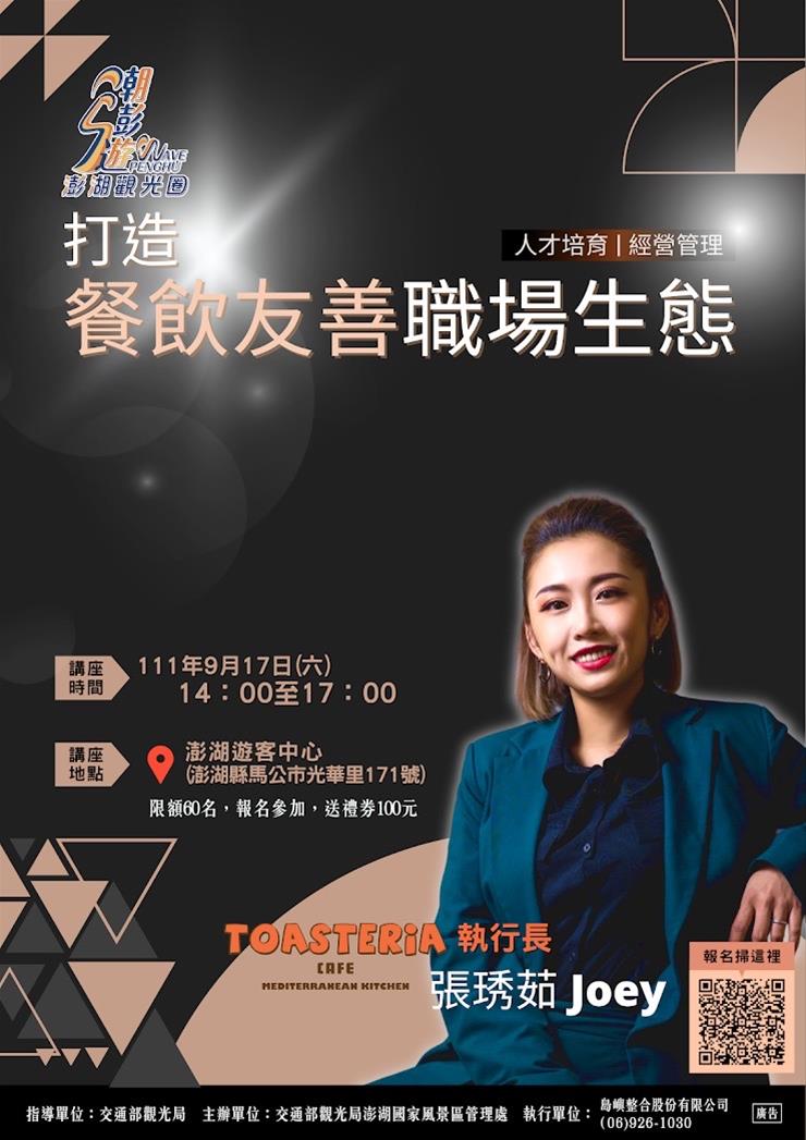 交通部觀光署澎湖國家風景區管理處(以下簡稱澎管處) 因應觀光圈成員及各產業經營需求,從不同面向邀請業界及各領域上的專業講師以實際的經驗分享、豐富輔導經歷來和澎湖觀光產業朋友們分享,訂於111年9月17日下午2時於澎湖遊客中心辦理澎湖觀光圈人才培育課程第三場次,經營管理主題課程-「從打造餐飲友善職場生態一探經營管理法則」。