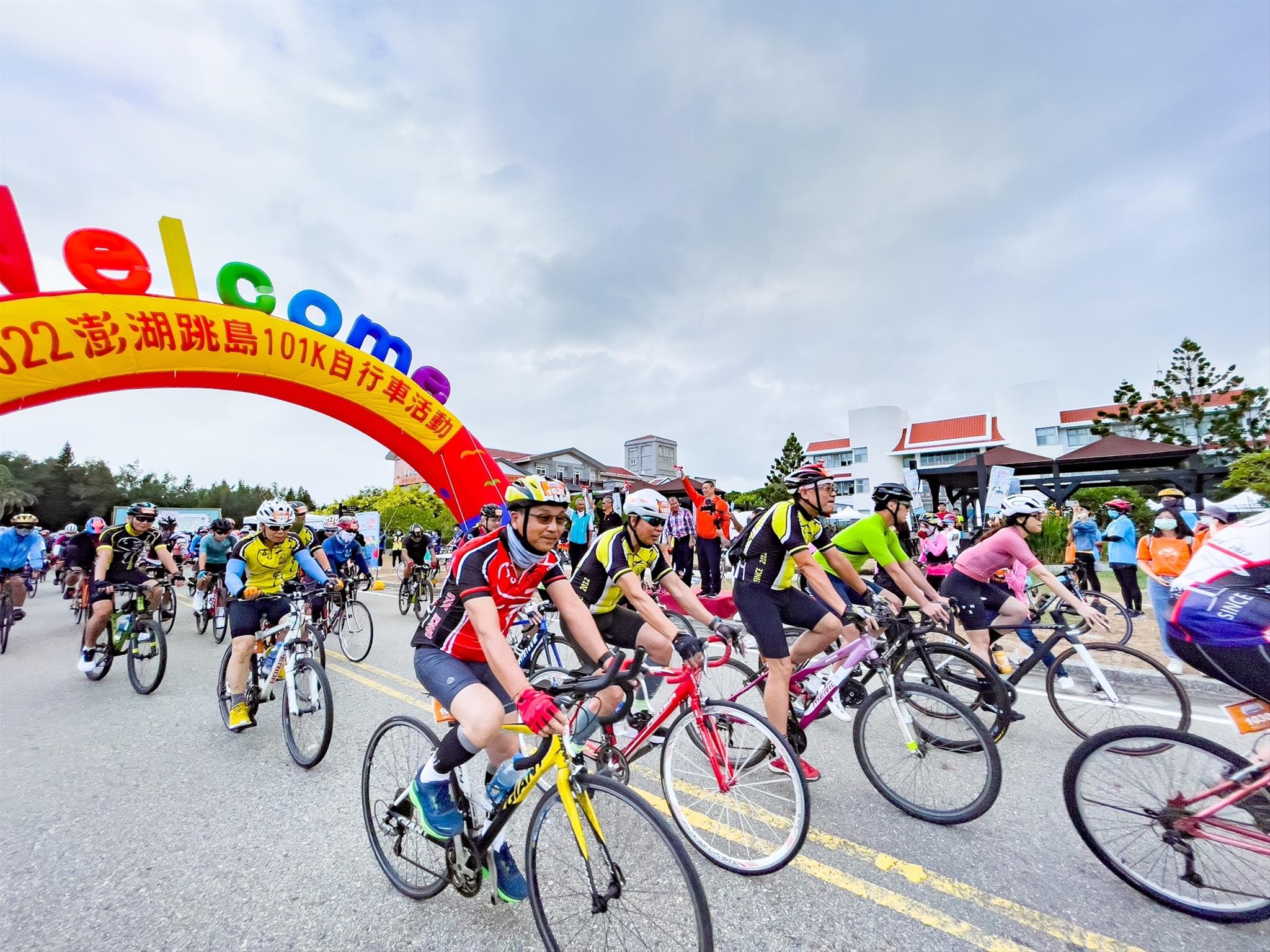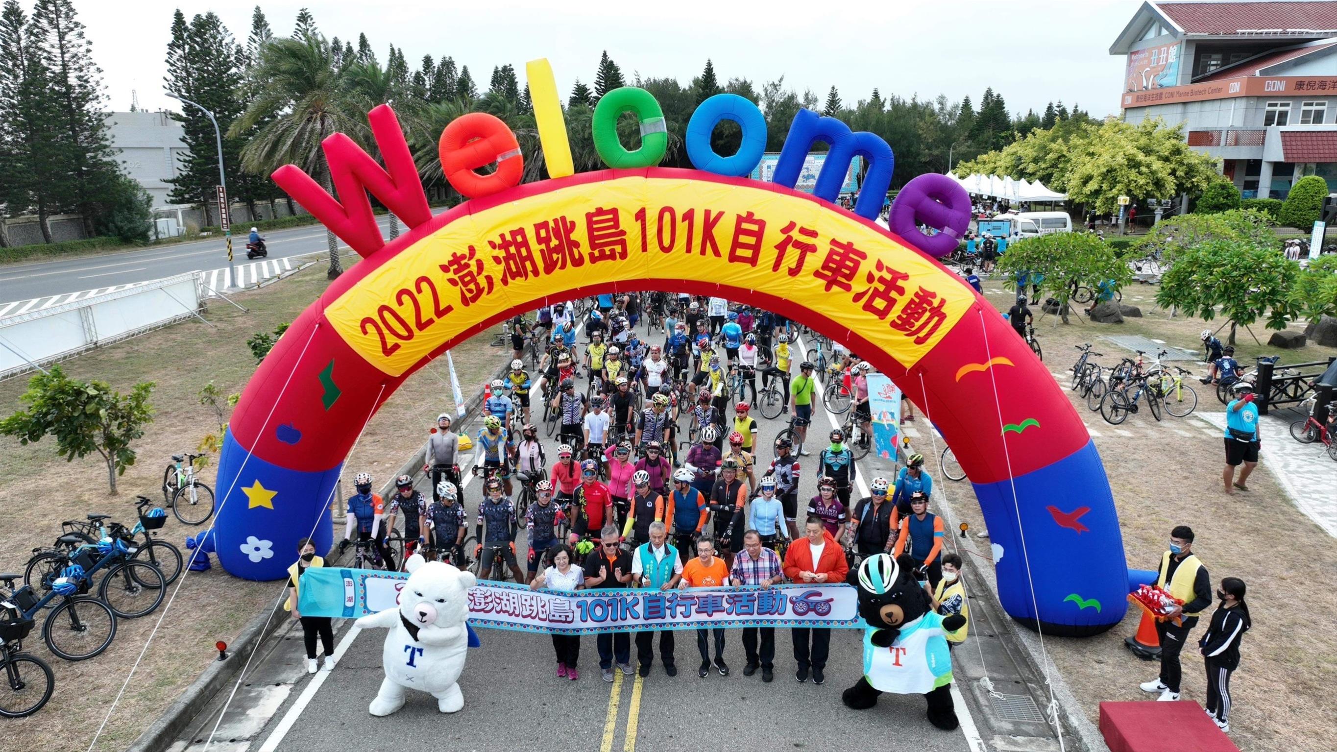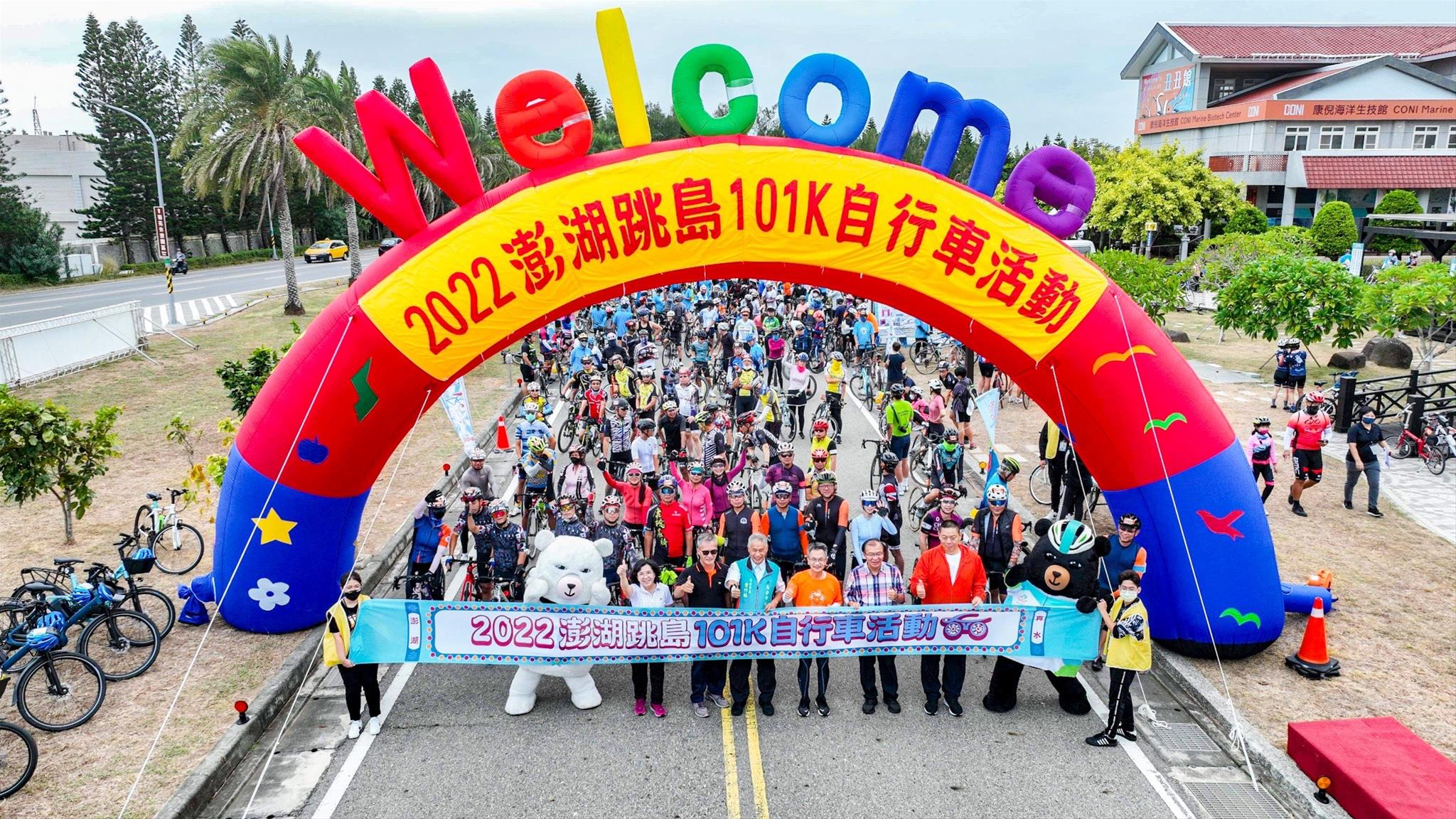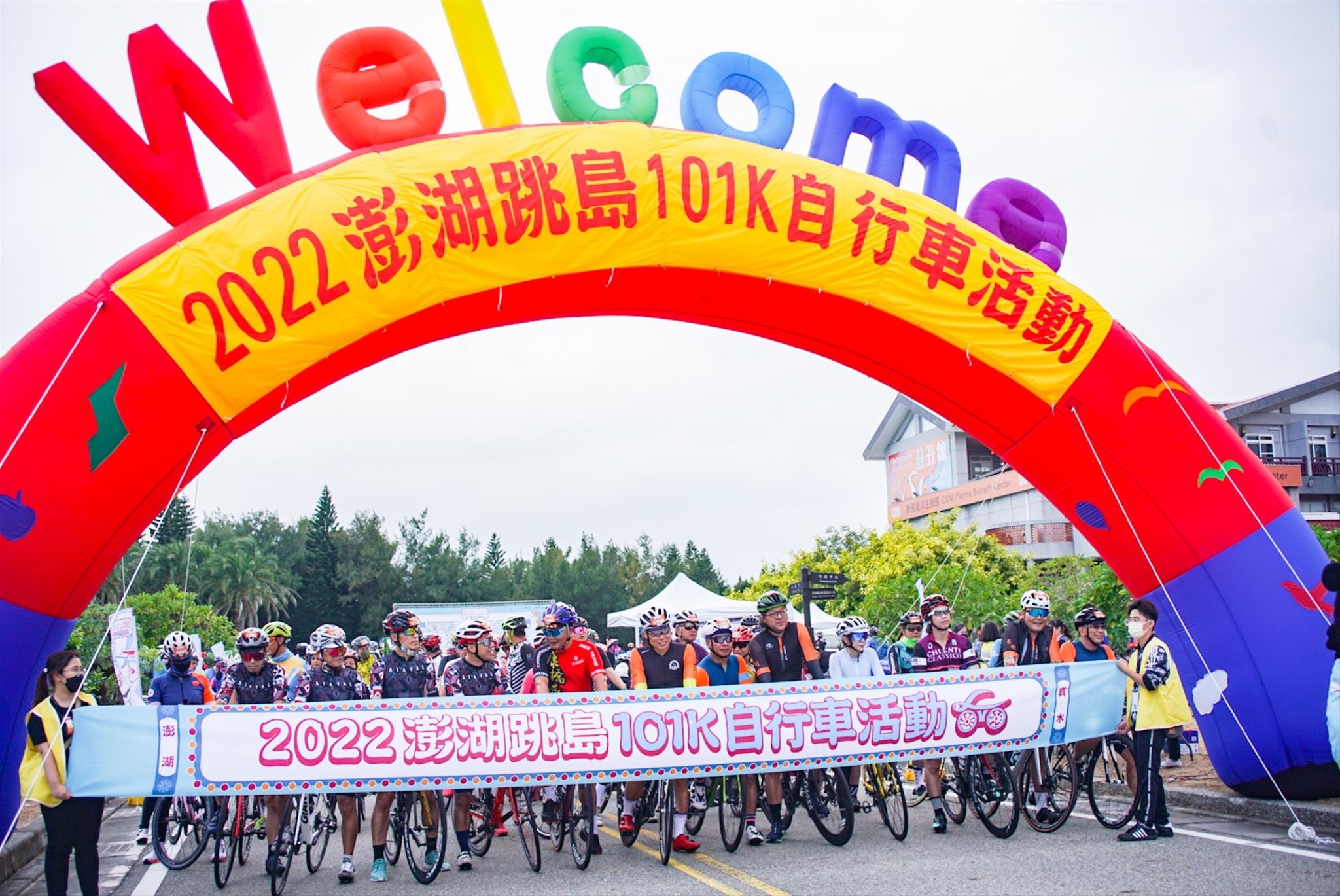 「2022澎湖跳島101K自行車活動」,由澎管處許宗民處長主持,並在出席嘉賓澎湖縣政府參議蔡淇賢、澎湖縣議會陳慧玲議員、澎湖縣馬公市公所市長葉竹林、澎湖縣議會藍凱元議員服務處主任洪長青、澎湖縣旅遊服務業職業工會榮譽理事長詹廷龍等共同舉槍鳴笛騎動下,隨即展開101K挑戰組及22K休閒組的分批出發。參與101K挑戰組的選手們,除了是挑戰自我的騎行旅程外,沿途必經之嵵裡沙灘、北寮摩西分海、跨海大橋及漁翁島燈塔等知名景點,更是許多自行車好手口中一定要來挑戰的「夢幻賽道」;而22K休閒組,一路上搭配趣味的集字「PENGHU-GO」闖關活動,深度探索澎湖村落文化,讓參與者輕鬆、放鬆、樂在騎中!並體會澎湖SING海風的樂趣。所有參與之車友,於沿途所規劃的補給站,亦可品嘗到尖山台電冰棒、黑糖糕、澎湖鹹餅及外垵刈包等特色小吃,期展現選手逆風而行的堅持,讓舒適接地氣,騎行更給力,增添活動趣味與精彩。