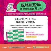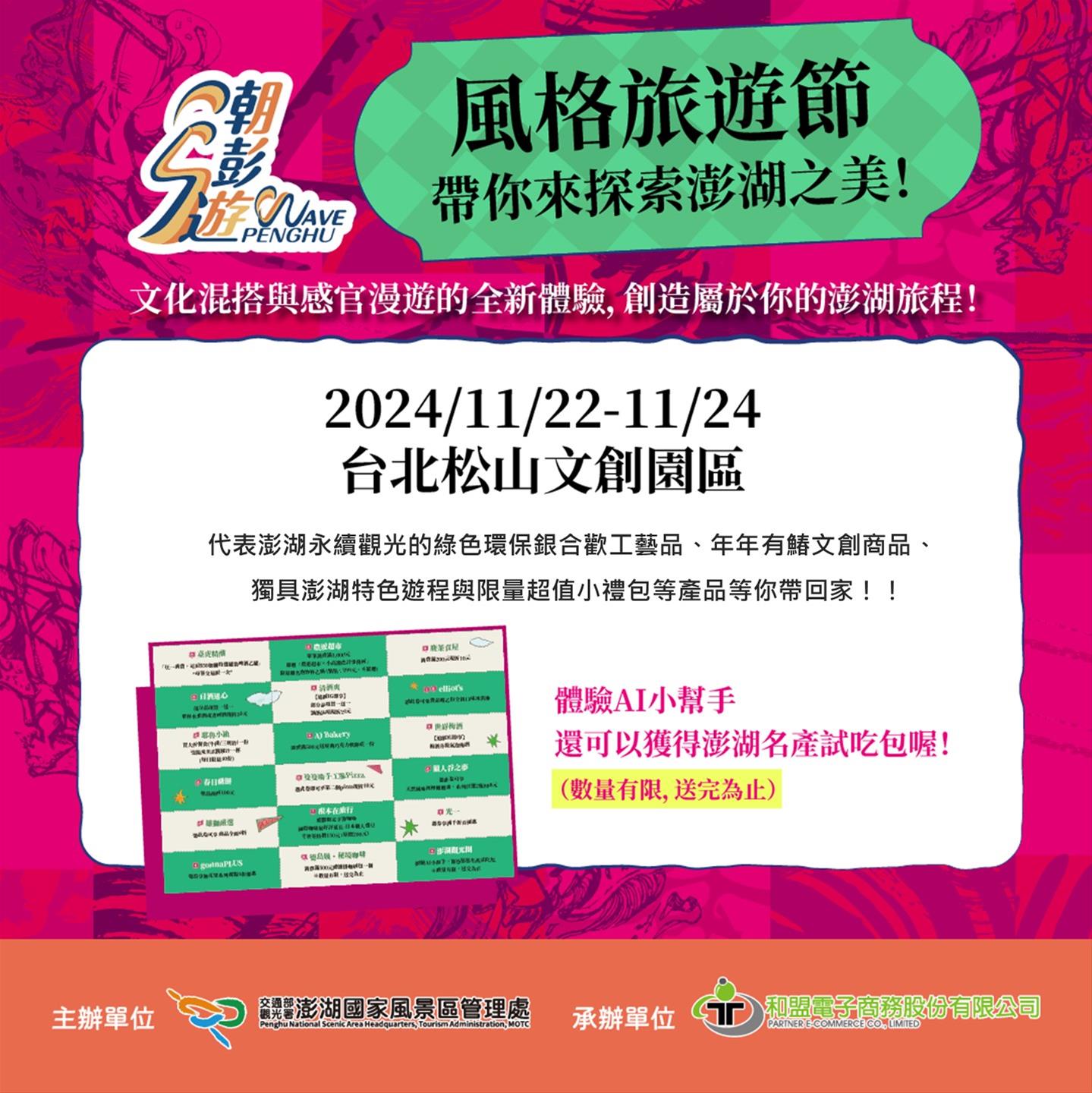 2024年度盛事「風格旅遊節」於11月23日(星期六)至11月24日(星期日)於台北松山文創園區熱鬧登場,澎湖觀光圈帶來多款特色產品、體驗活動以及道地美食,邀請大家一起來感受澎湖的在地文化之美!