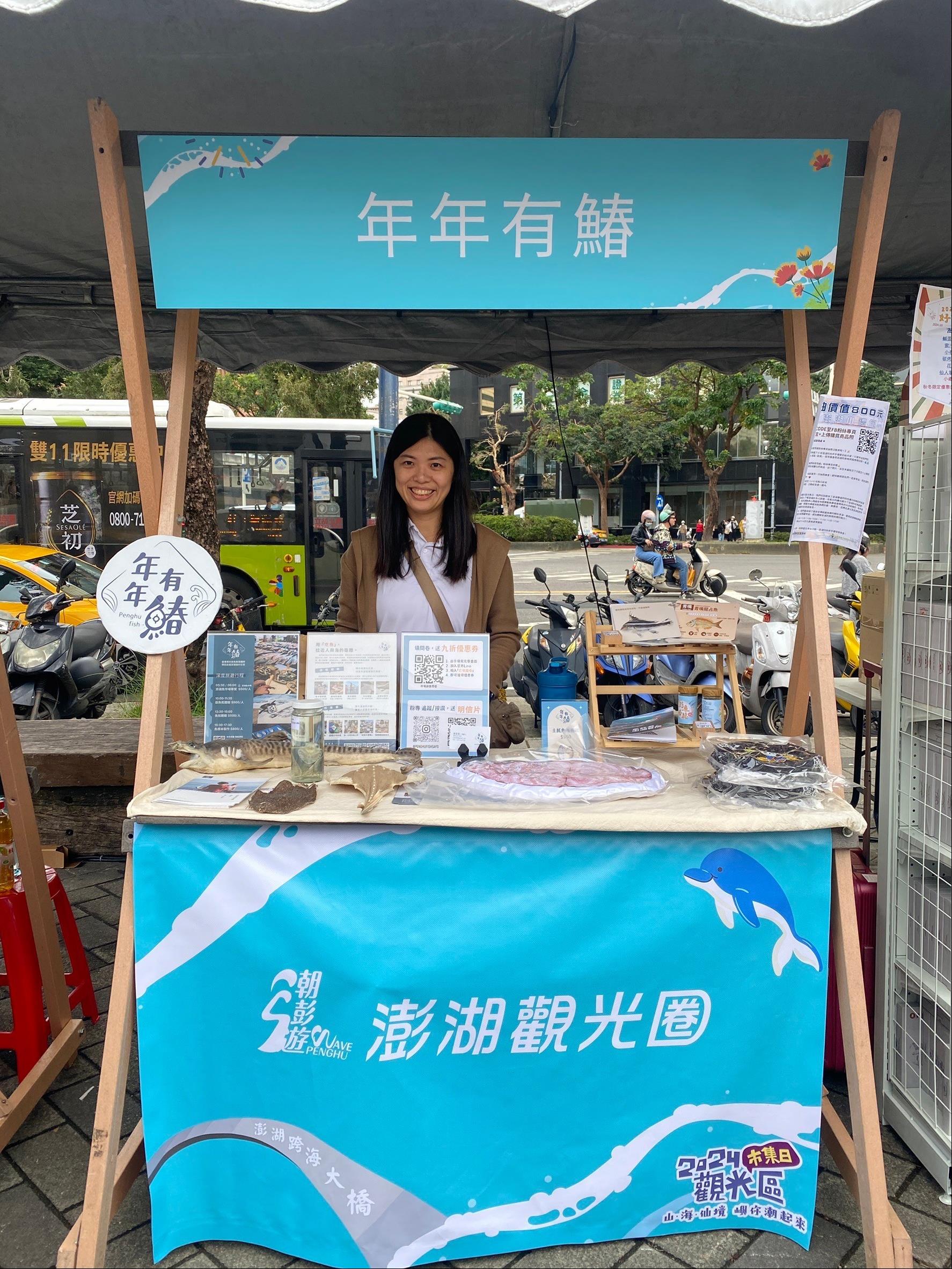 此次澎湖觀光圈特別安排了由海天文創柯蔘海老師製作的銀合歡工藝品、年年有鰆的海洋教育宣導小物、繪本等展售商品。海天文創以綠癌銀合歡為材質製作的文創產品,傳達環保、資源再利用的概念,現場亦有DIY材料包供消費者選購,帶領大家無門檻輕鬆進入手作世界,體驗親手製作各種繽紛又實用的手工藝品,並在過程中獲得滿滿的樂趣;推廣食魚教育及海洋生態保育的年年有鰆,也在現場展示一比一的土魠娃娃、土魠輪切抱枕等各項文創商品及書籍圖鑑,讓更多人了解「魚」從大海到餐桌的歷程,用「吃魚」拉近人與海的關係,並期望人人都能透過選擇對海洋友善的海鮮,讓海洋得以永續發展。