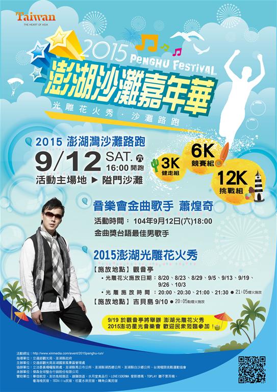 光雕花火秀場次依序為8月23日、8月29日、9月5日、9月13、9月19日、9月26日及10月3日於觀音亭晚間20:00、20:30、21:00及21:30起分別以不同音樂呈現光雕及澎湖在地特色,更於21點05分於西瀛虹橋施放花火,此次之花火秀更增加了水中爆破之亮點。另9月10日則特別安排於吉貝島上晚間8時光雕秀及花火施放,歡迎有興趣的民眾前來現場欣賞。詳情可參考「2015澎湖沙灘路跑嘉年華」官網(http://www.xinmedia.com/event/2015penghu-run/)或雄獅旅遊官網-澎湖館(