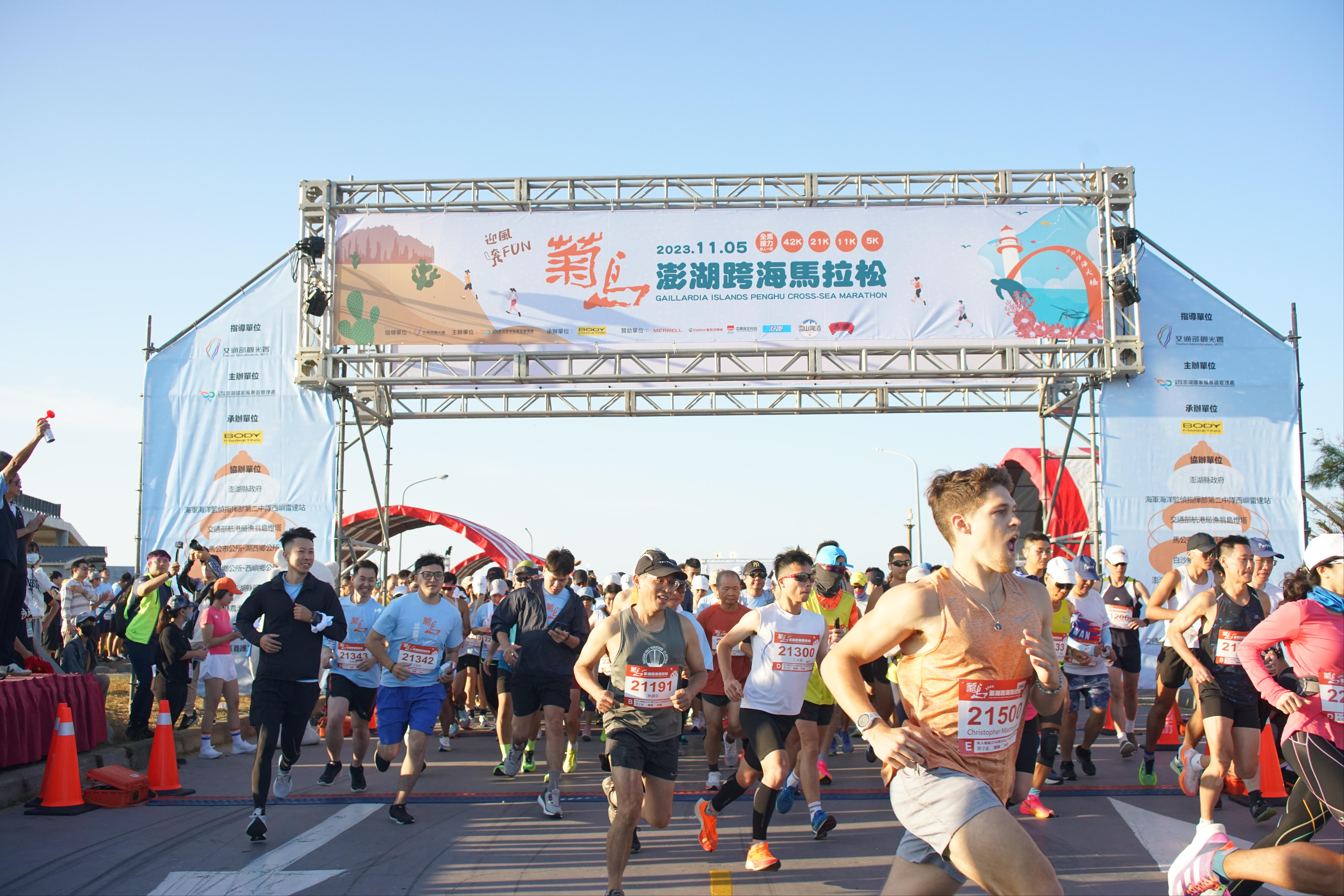 交通部觀光署澎湖國家風景區管理處(以下簡稱澎管處)為型塑澎湖的運動旅跑意象,增添澎湖秋冬季節觀光風采,於112年11月5日(星期日)上午6時30分在西嶼西臺遊客中心廣場舉行第六屆「2023菊島澎湖跨海馬拉松」活動,來自12個國家共49位國際選手、台灣本島選手2,725位及澎湖在地選手1,097位等,共3,871位跑者共同參與此盛會,堪稱歷年最多選手共襄盛舉,迎風奔Fun,一同挑戰自我極限,熱情開跑!
