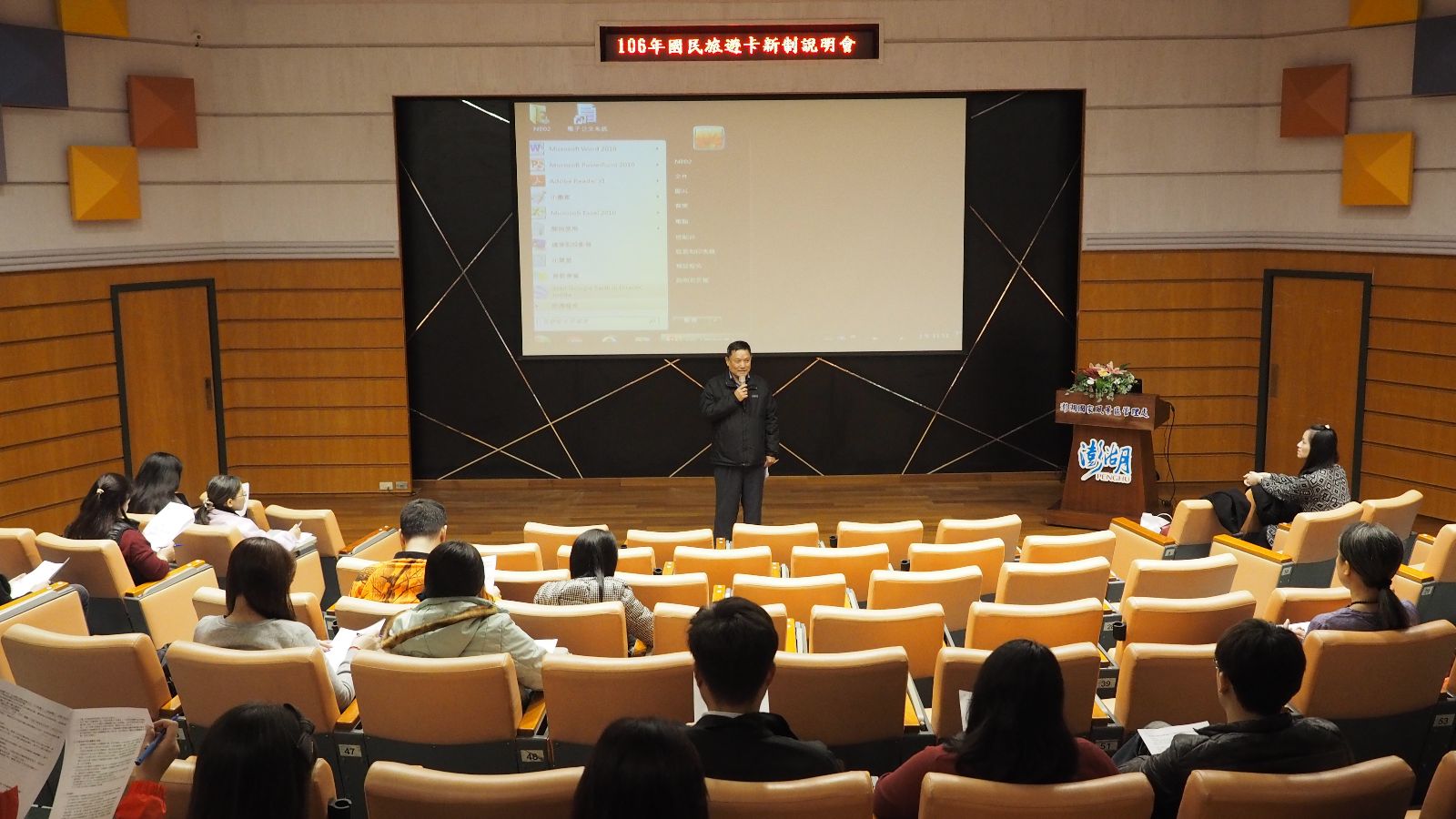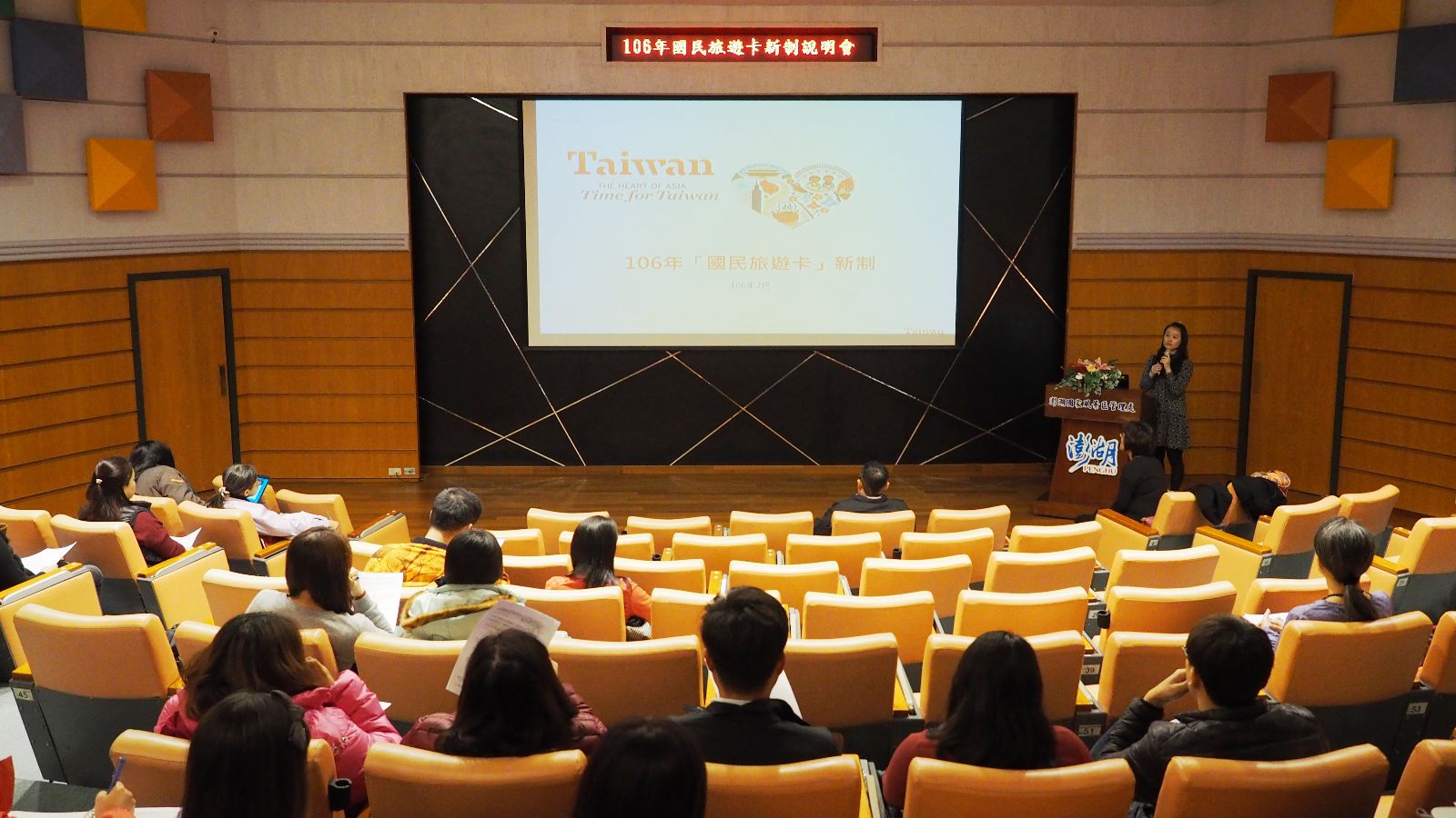 為響應國民旅遊卡國內旅遊消費的政策,並提供一般廣大旅客參加國內旅遊有更多選擇,提昇國內旅遊品質,交通部觀光署於昨(8)日假澎湖遊客中心視聽室,辦理「106年國民旅遊卡新制」說明會。由澎管處副處長謝文達主持,交通部觀光署業務組劉彥妤及旅行業品質保障協會副秘書長吳美惠分別說明「106年國民旅遊卡新制」、「2017國旅卡推薦優質行程」講授說明,吸引本縣旅行業者30餘人參加。