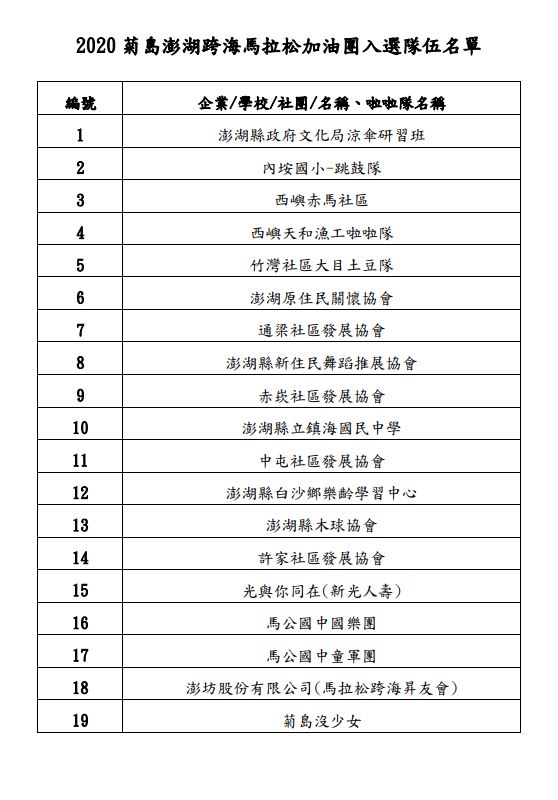 2020菊島澎湖跨海馬拉松加油團入選隊伍名單如附件。