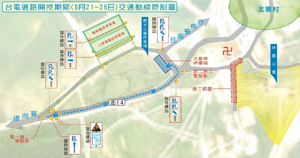 北寮奎壁山地質公園前道路自104年8月21日起至104年8月28日止辦理管線地下化工程,將封閉道路及交通管制