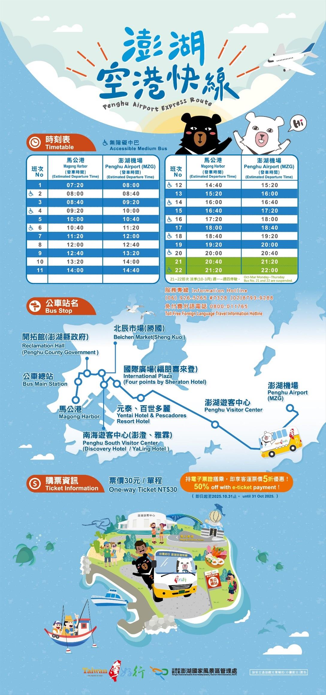 本次路線將新增北辰市場(勝國)站與開拓館(澎湖縣政府)站,調整國際廣場(福朋喜來登)及公車總站上下車位置,並將原有的第三漁港(雅霖)站與澎澄飯店(南海遊客中心)站合併為南海遊客中心(澎澄、雅霖)站,起迄站點調整為澎湖機場及馬公港,使路線更加深入馬公市區,滿足旅客對市區與景點的多元需求,此外,電子票證半價優惠更延長推動至114年10月31日止,歡迎有需求的民眾多加搭乘使用。