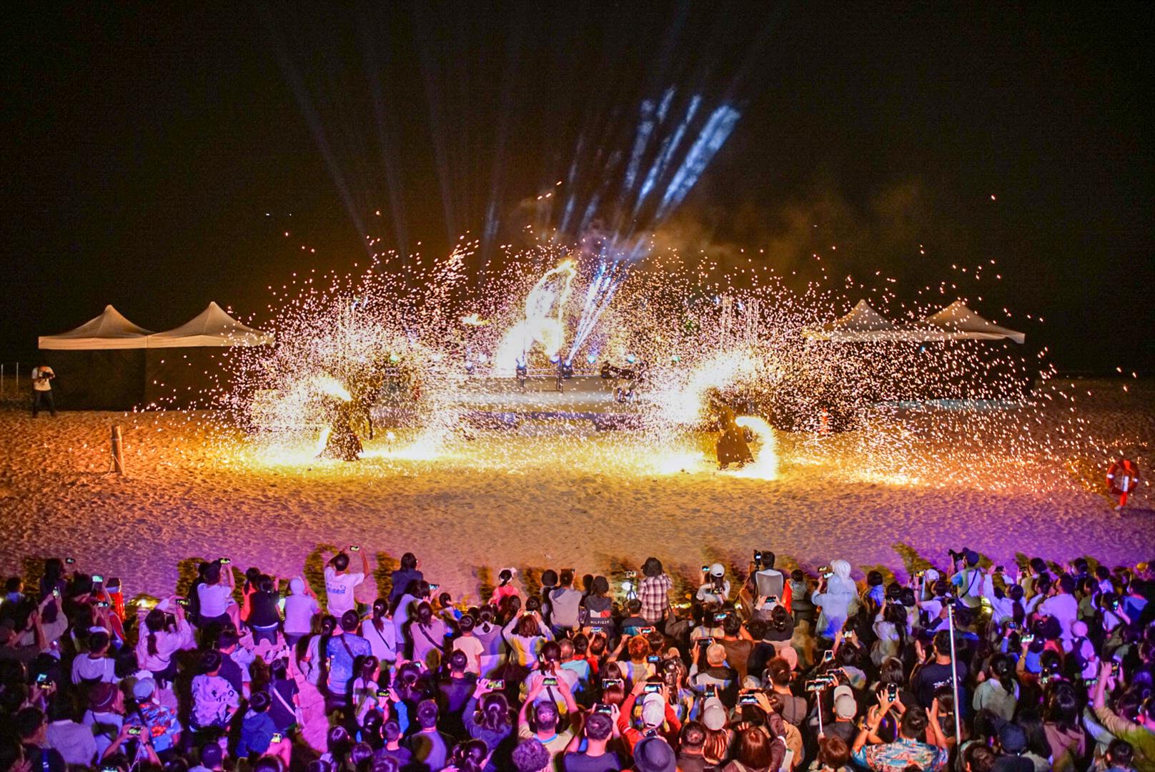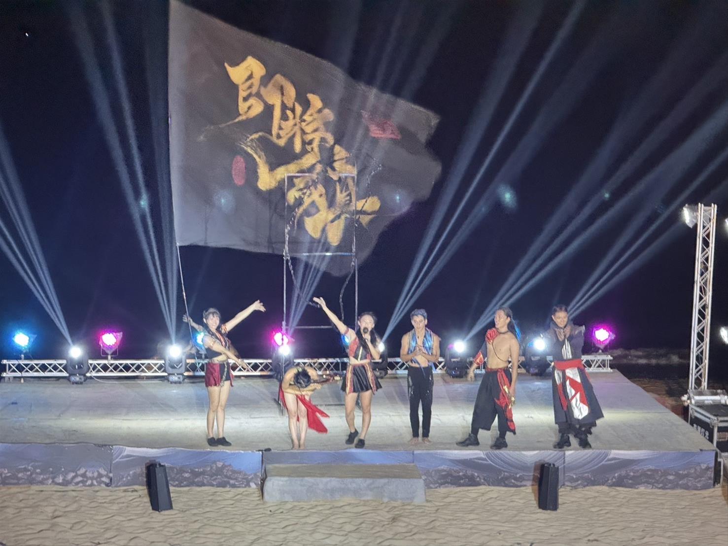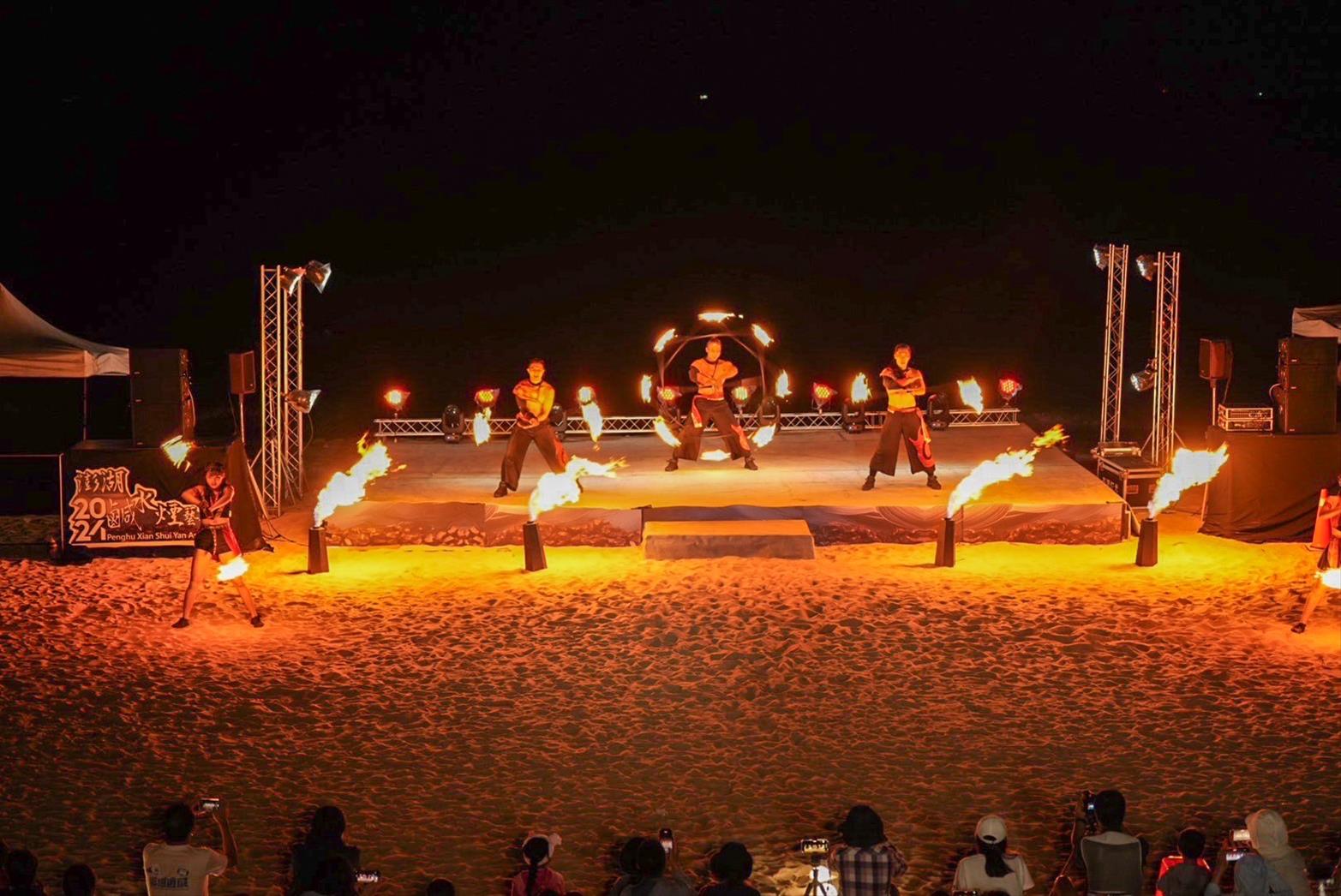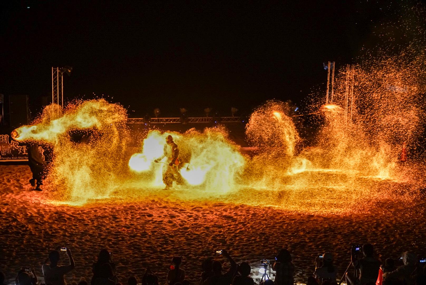 當天氣氛最高點的部分莫過於晚上6點至7點的壓軸即將成真火舞團,即將成真以令人屏息的火舞演出震撼全場,分別以第一幕-「海濤湧心」展現澎湖島民與自然的緊密聯繫。當火花映照隘門沙灘,劉佳瑩老師的琵琶樂聲與海潮交織,傳達出澎湖大地與大海之間的深厚連結;第二幕-「岩之頂幕」特邀倒立大師陳育偉以其穩固如玄武岩般的姿態,在椅子上層層堆疊,模仿澎湖壯麗的玄岩景觀;第三幕-「鹹水的火花」則運用高達三層樓的火焰與20公尺長的火花將澎湖的夜晚點燃,火光燃起象徵澎湖魂魄的火焰,連結過去、現在與未來,喚醒每個觀眾的熱血與力量,強調了火光與人文精神的融合,也為這場演出畫下壯麗的句點 。隨著夜幕低垂,火舞團的表演在沙灘上劃出一道道燦爛的火焰,將開幕活動的氣氛推向最高點,讓現場觀眾驚呼連連!