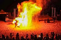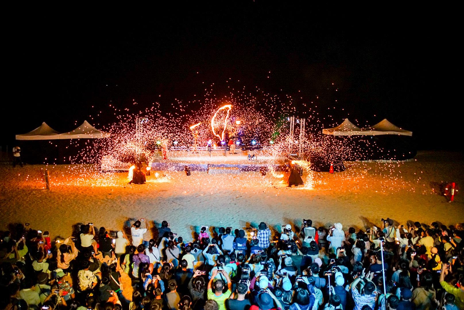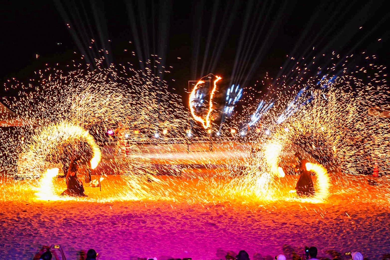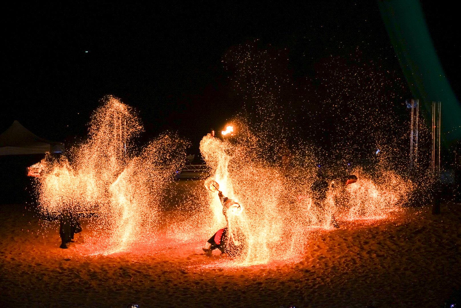 當天氣氛最高點的部分莫過於晚上6點至7點的壓軸即將成真火舞團,即將成真以令人屏息的火舞演出震撼全場,分別以第一幕-「海濤湧心」展現澎湖島民與自然的緊密聯繫。當火花映照隘門沙灘,劉佳瑩老師的琵琶樂聲與海潮交織,傳達出澎湖大地與大海之間的深厚連結;第二幕-「岩之頂幕」特邀倒立大師陳育偉以其穩固如玄武岩般的姿態,在椅子上層層堆疊,模仿澎湖壯麗的玄岩景觀;第三幕-「鹹水的火花」則運用高達三層樓的火焰與20公尺長的火花將澎湖的夜晚點燃,火光燃起象徵澎湖魂魄的火焰,連結過去、現在與未來,喚醒每個觀眾的熱血與力量,強調了火光與人文精神的融合,也為這場演出畫下壯麗的句點 。隨著夜幕低垂,火舞團的表演在沙灘上劃出一道道燦爛的火焰,將開幕活動的氣氛推向最高點,讓現場觀眾驚呼連連!