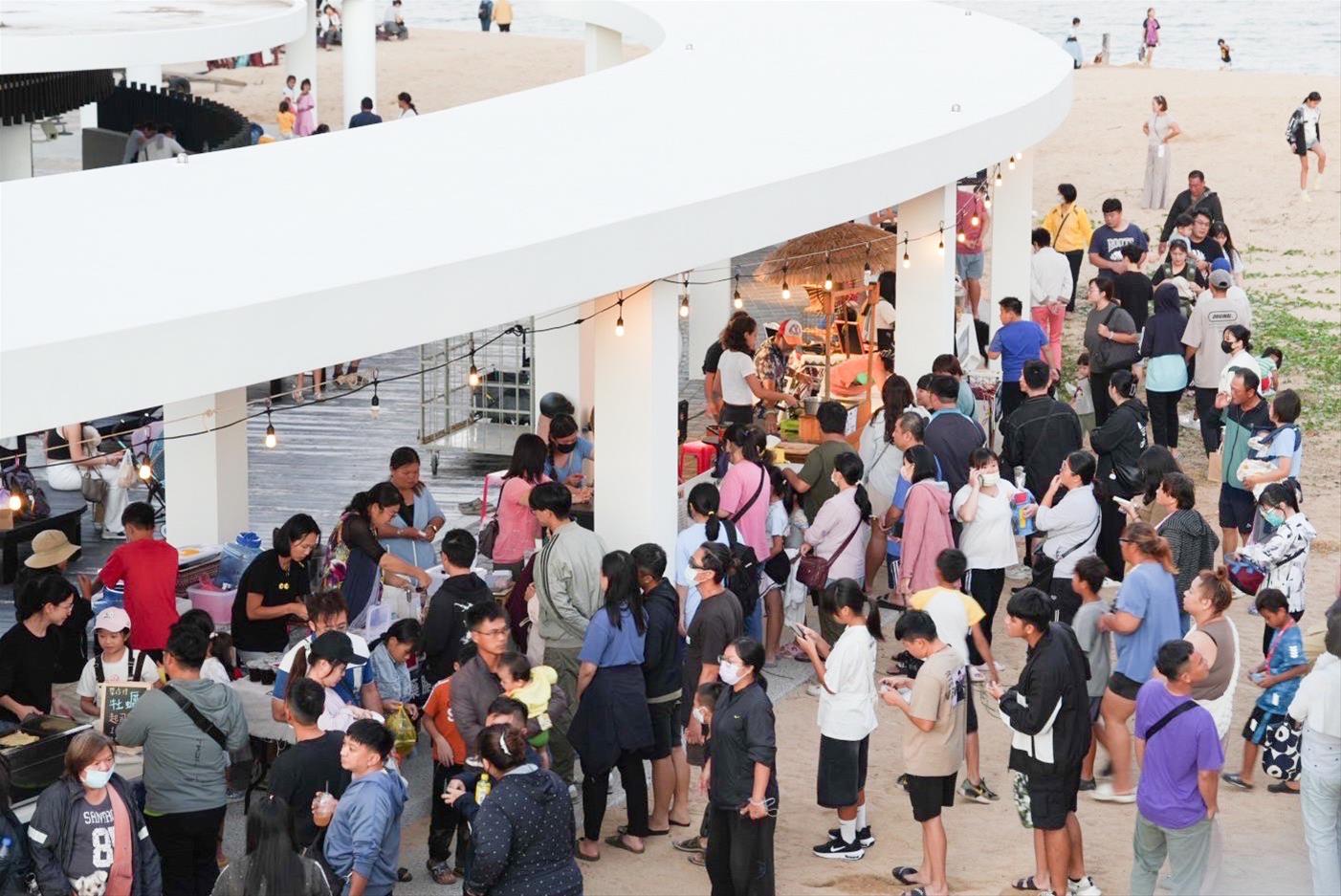活動於下午4點鹹水煙市集熱鬧開張,市集中擺滿了澎湖在地美食及手作文創商品,吸引了不少民眾駐足選購,品嚐澎湖當地風味,更體驗在地文化,享受輕鬆愉快的氛圍。除了鹹水煙市集外,還有下午4點至5點的沙灘排球體驗活動。儘管東北季風吹起,這項互動性強的運動吸引了許多排球愛好者參加,無論是新手還是資深玩家,都在沙灘上盡情揮灑汗水,感受著陽光與秋風帶來的快感。