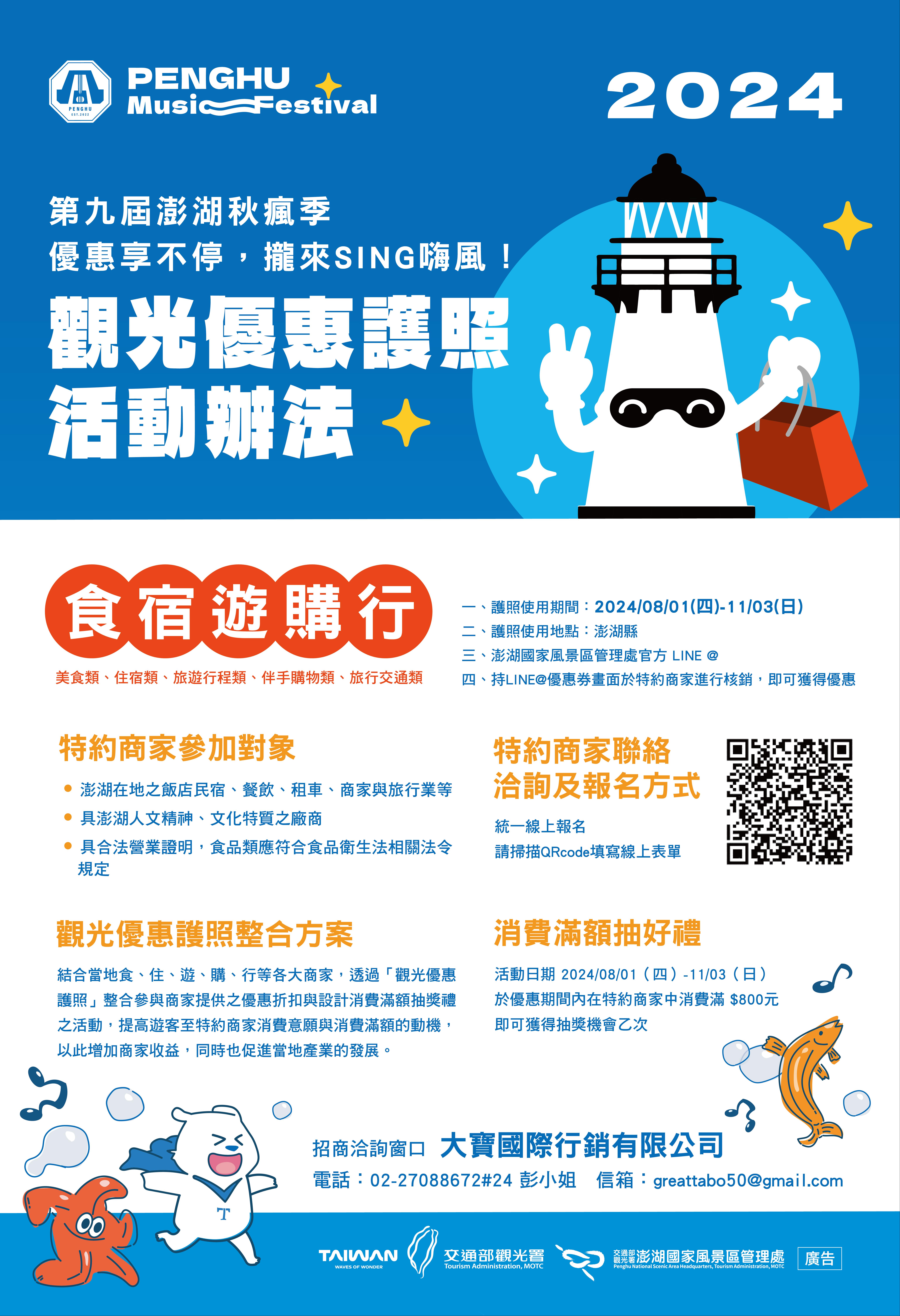 觀光優惠護照目前正擴大邀募合作店家業者,誠摯邀請澎湖地區各百貨、旅宿、餐飲、特產店、旅行社等食宿遊購行業者或公、私部門展館共同參與,一同提升當地產業的觀光價值,並請廣為宣導周知。有意願參加或欲知詳細之專案合作內容的朋友,可逕洽本案聯絡窗口彭小姐;服務專線02-27088672#24。報名表: