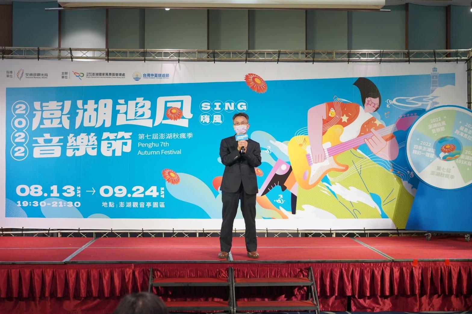 「2022澎湖追風音樂節」為今年度觀光系列活動之最大亮點,將於8月13日假馬公市觀音亭盛大開幕,澎管處許宗民處長表示:這兩年由於受到疫情影響,重創澎湖觀光旅遊,因此特以追風為主題精心策劃推出「2022澎湖追風音樂節」,希望藉由澎湖獨有海島風情、人文藝術、星光月色等浪漫情愫,融合音樂和光韻的律動,來紓緩國人因疫情而緊張緊繃的心情,也重新點亮心中的希望,特別是來到一年四季皆有不同特色風情的澎湖,在踩踏澎湖每個角落之中,感受澎湖獨一無二的地理人文風情,創造及帶動另一波澎湖旅遊熱潮。