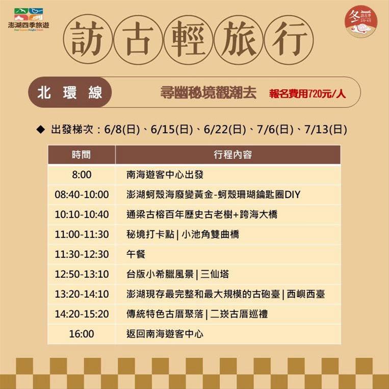 北環線-尋幽訪古之旅一日遊;藉由趣味DIY,製作「蚵殼珊瑚鑰匙圈」,實踐海洋廢棄物再利用理念;探訪百年古榕樹與壯闊的跨海大橋;在小池角雙曲橋留下最美海景回憶;登三仙塔俯瞰「澎湖小希臘」外垵漁港;造訪古老的西嶼西臺砲台,感受澎湖在歷史上的戰略地位;漫步二崁古厝聚落,欣賞石砌建築,穿越時光隧道。