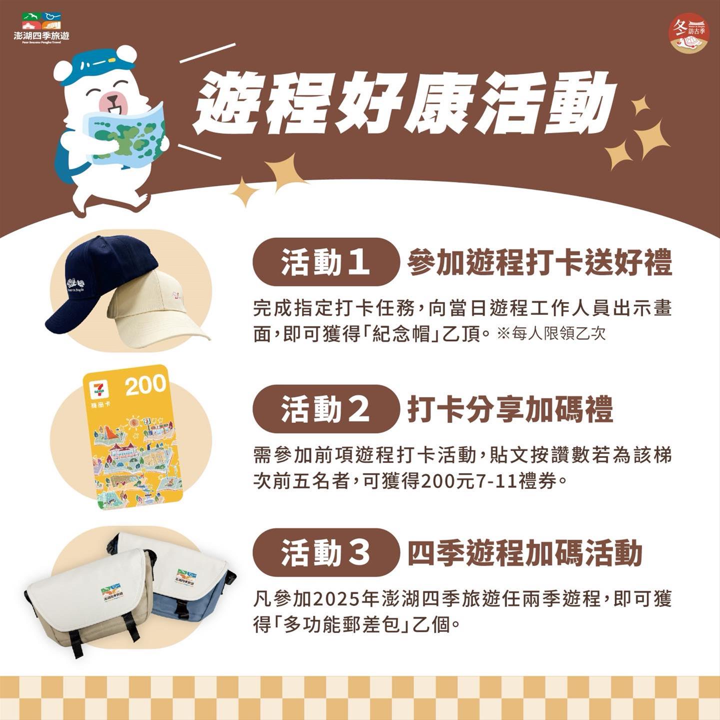 好禮三:凡參加2025年「澎湖四季旅遊」任兩季活動,即可獲得「多功能郵差包」乙個!