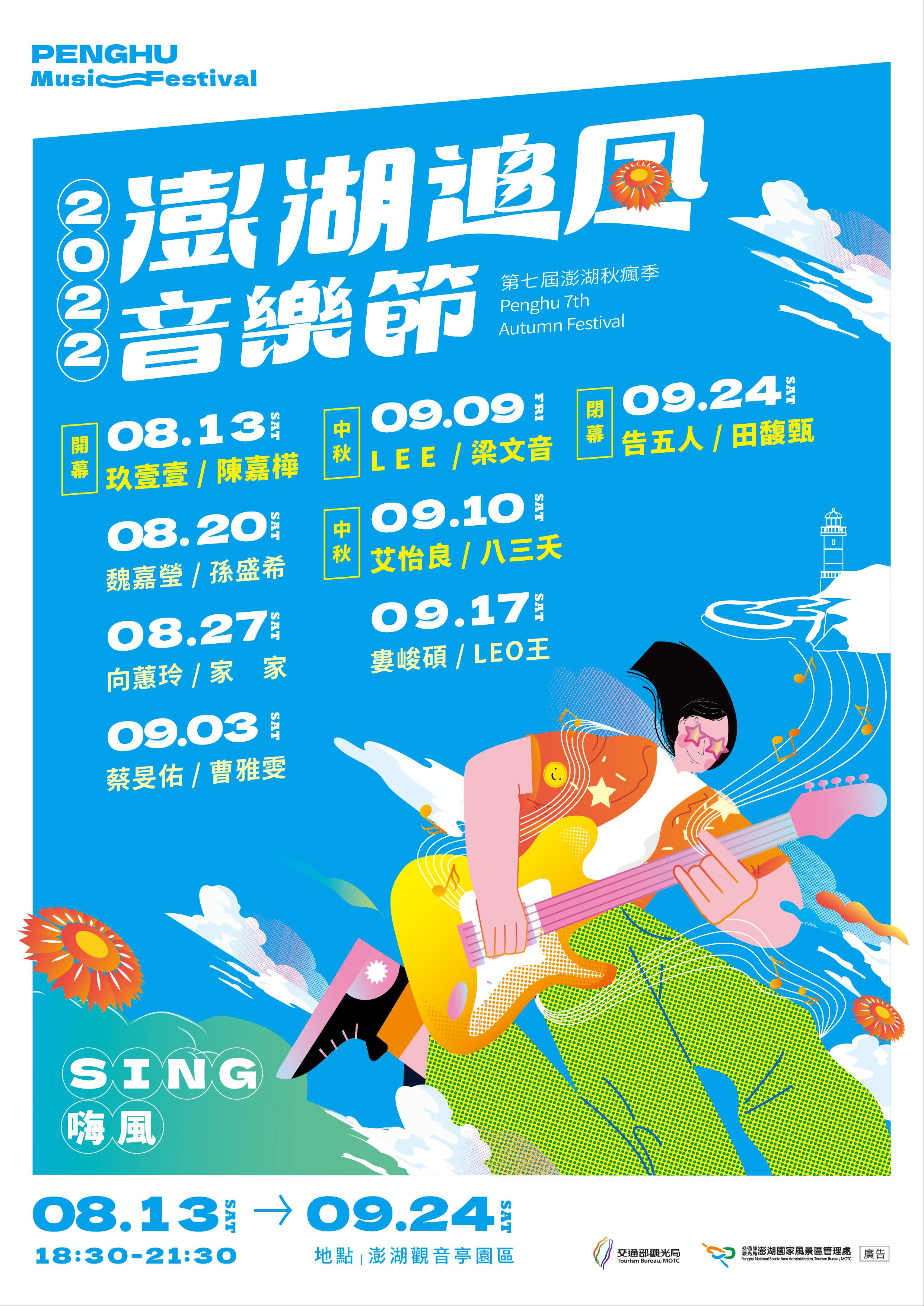 「2022澎湖追風音樂節」將於8月13日至9月24日每周六及中秋連假舉辦8場次音樂盛會,在夏末秋初之際,以追風為主題,將音樂節融入澎湖季風特色,邀請重量級演唱卡司,並配合場地周邊光環境營造浪漫有趣的氛圍,以嶄新型態登場。