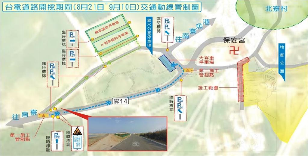 北寮奎壁山地質公園前管線地下化工程,原訂104年8月28日完成施作,因天候因素影響,封閉道路及交通管制將延至104年9月10日止