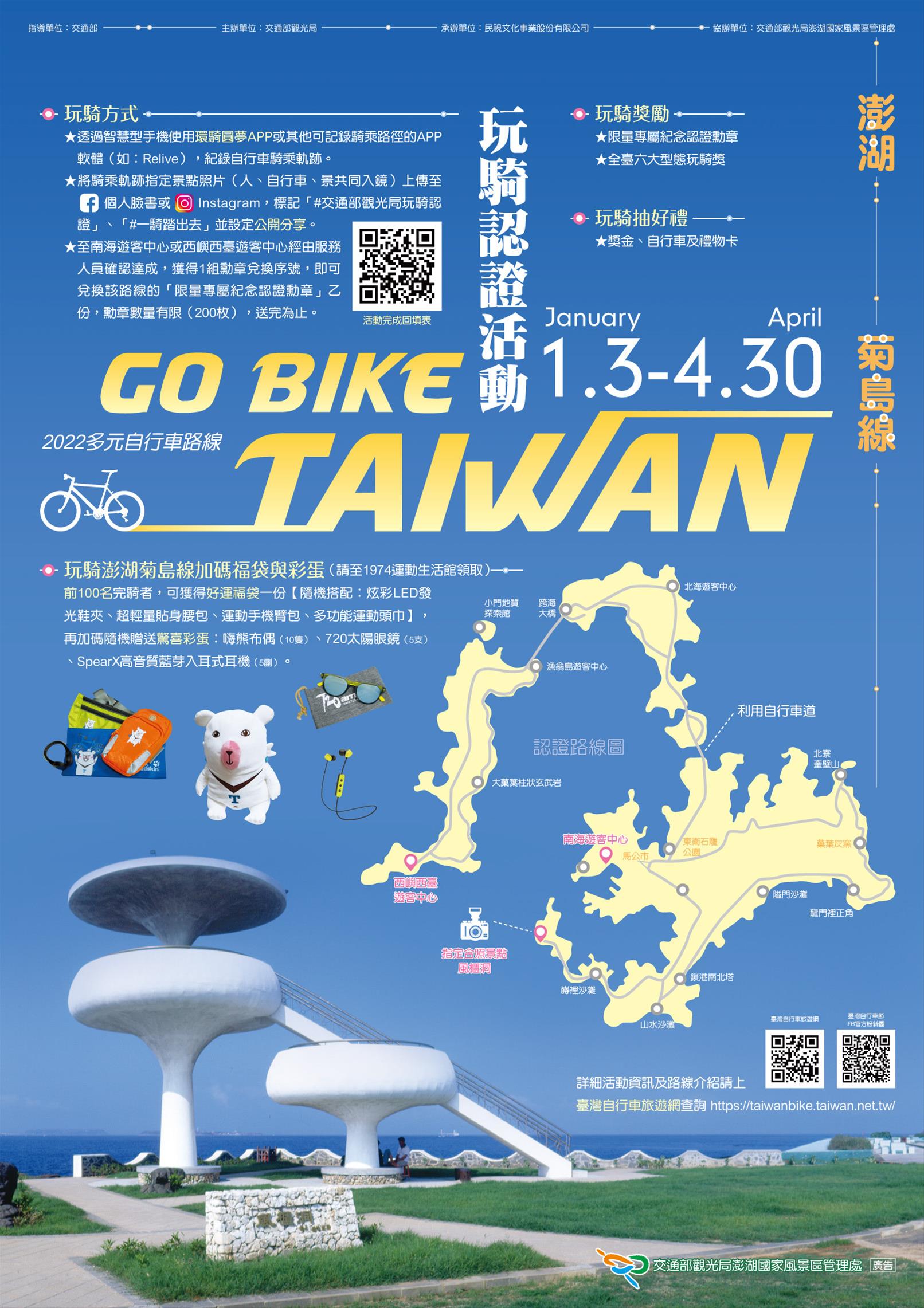 交通部觀光署為推廣「2022自行車旅遊年」,主辦「16條多元自行車路線」之2022多元自行車路線《Go Bike TAIWAN玩騎認證》活動,於111年1月3日至4月30日期間,車友騎行任一條自行車多元路線,將騎乘路徑紀錄軌跡及指定景點合影照片(人、自行車、景共同入鏡)上傳至個人臉書或Instagram,並標記「#交通部觀光署玩騎認證」、「#一騎踏出去」公開發布後,前往指定的遊客中心由服務人員確認,即可獲得該路線的專屬紀念認證勳章,還有機會抽大獎。