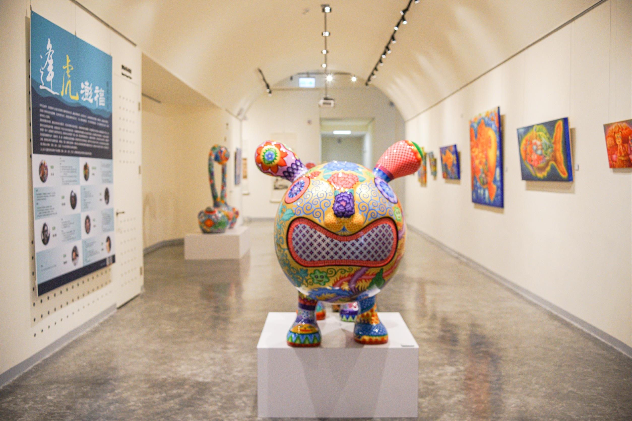 另為增添「澎湖遊客中心」之遊憩內涵,以及呈現多樣風情與藝術之美,讓民眾更貼近及深刻感受海洋新視野與文創藝術想像空間的心靈之旅。澎管處於「澎湖遊客中心」特規劃有常態性藝術創作之展覽空間,首次配合開幕活動以「夢幻海洋-逢虎澎福」為主題,邀請國際知名藝術家洪易老師及本縣藝術達人等前來設展,期透過藝術家們獨特的創思和喜樂的符號,在這個美好的環境下,建構一處海洋文化與民眾生活的藝術展示平台,並希望藉由充滿想像力及愉悅感的生活美學,讓更多人認識澎湖海洋生態環境與文化藝術的瑰寶。「夢幻海洋-逢虎澎福」藝術特展之展期,即日起至6月30日止,為期3個月,歡迎一起來體驗這片土地的深刻記憶。