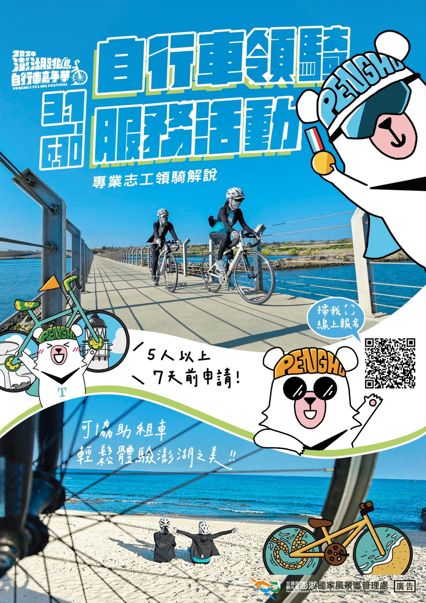 交通部觀光署澎湖國家風景區管理處(以下簡稱澎管處)近年積極發展綠色永續運動觀光,尤其推動自行車領騎服務多年已在台灣自行車界打響品牌與知名度,今(113)年3月1日起至6月30日止,開放免費領騎及隨車(隊)解說服務,由專業解說志工帶隊,穿梭於澎湖濱海、漁村古厝、軍事古蹟等,感受菊島不同風情的騎乘享受,車友團體只需5人(含)以上,於7天前透過線上報名表即可預約申請(領騎服務申請表單網址: