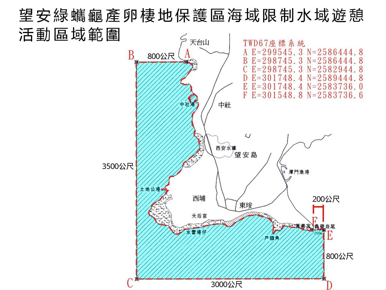 青灣內灣海域、隘門海域、山水海域、望安綠蠵龜產卵棲地保護區海域水域遊憩活動之罰鍰金額 公告附圖 望安綠蠵龜產卵棲地保護區