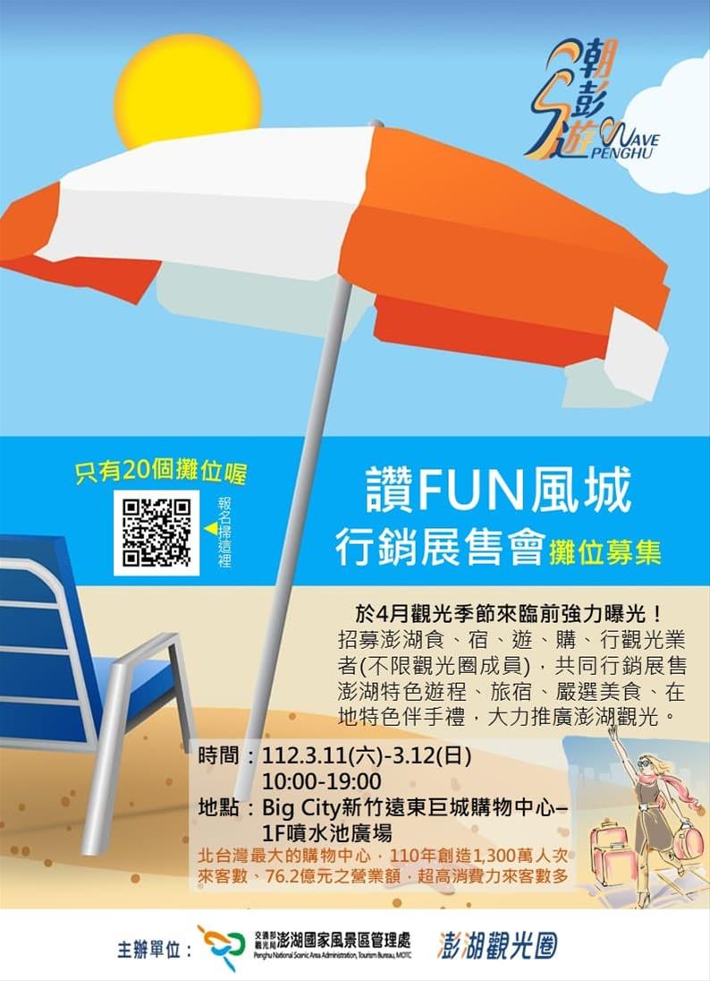為吸引國內外遊客到澎湖旅遊,創造澎湖觀光的國際品牌形象,交通部觀光署澎湖國家風景區管理處聯合澎湖觀光圈在4月旅遊旺季來臨前大力推廣澎湖觀光產業,將於112年3月11日至12日連續二天至Big City新竹遠東巨城購物中心–1F噴水池戶外廣場舉辦行銷展售會,廣邀澎湖之食、宿、遊、購、行等相關觀光業者(不限觀光圈成員)參加,推廣特色遊程,營造魅力亮點,創造觀光效益。此次規劃設置二十個攤位,預計招募澎湖觀光業者,共同行銷展售澎湖特色遊程、旅宿、嚴選美食、在地特色伴手禮,大力推廣澎湖觀光。