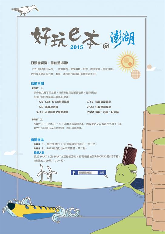 現在,本處想要將來過菊島的旅人回憶聚集起來,不論是多年前來過的也好,剛剛離開澎湖的也好,甚至旅居、長住、在地的澎湖人也好,一起分享在菊島旅遊、生活的大小事,並將這些分享集結成屬於澎湖的旅遊書─「2015澎湖好玩e本」。